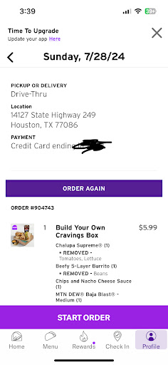 Now at home I checked more issues. They used some unknown chunky salsa type sauce on the Mexican pizza and they used taco filling instead of advertised steak for the rattle snake fries. Wholly making that item not limited time at all and a serious bait and switch. Will see how the follow up calls go. Not satisfied at all and one of the worst fast food...