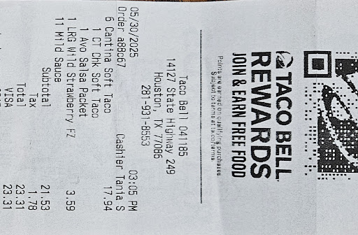 Read moreUsed drive through. While they didn't get my 3 item order wrong. There were multiple issues. There was a wait I was told for limited time rattle snake fries. Was told to wait in parking lot for order. Took close to a 15 minutes wait. Was told they put "all" the taco Bell sauces in the bag when inquiring about sauces. There were none. Had to go inside. Defeating purpose of drive through. Didn't raise the issue. Just did a cursory item check then went home.