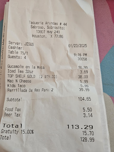 Read moreFood was good, service was not. No one came to sit us, so family and I picked a table at front, but still had to wait for someone to come serve. Waiter (with purple dyed hair) finally came to get our drinks, then forgot about us and sent another server to get the drink order again. Menus werenât brought until we asked. Waitress that took over was disrespectful with her unnecessary remarks when I asked about the tortillas I had ordered (meal almost half way done by this time). If this was my first time at this location, I wouldnât be back. This is the first time experiencing this kind of service here. I would understand if we showed up close to closing time and they didnât have items available or if they were busy/short staffed, but this was about 7pm and not busy. I hope this feedback can be constructive for management to improve staff and/or can provide the necessary training for employees to give quality customer service even when they are having a bad day. This is definitely the reason I donât go to other Taqueria...