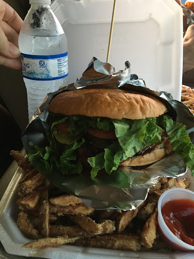 At first, this looks like an ordinary food truck. Brightly colored, menus on the side, and the smell of frying and grilling encasing it in a mouth watering cloud. But I'm here writing this, eyes blurry, hands shaking, barely sure how I survived the avalanche of food that came pouring from it's doors to tell you it is anything but ordinary. I ordered three burgers, and some boudin, for four adults and two children. Concerned that perhaps it wouldn't be enough, I added an order of loaded sausage fries, because meat and potatoes seemed the order of the day. By the time I managed to secure the loot in the trunk of the tiny Corolla, suspension now dangerously overloaded, I counted no fewer than nine full clamshells. I can see seven of them from my current place, beached on the couch and slightly panting. I wanted to stop after the first half of a hamburger the size of my child's skull (I checked), but the savory-sweet-crunch and the crisp and tangy vegetables kept me firmly chewing. I finally had to be physically removed from the table. An inordinate, a gargantuan, a colossal, nay a purely hedonistic mountain of food remains despite my concerted efforts and those of my companions. If I eat another bite I shall detonate in a glorious shower of conecuh sausage and ground beef; they will be scraping my remains off the ceiling and walls for weeks. But, perhaps just one more fry...