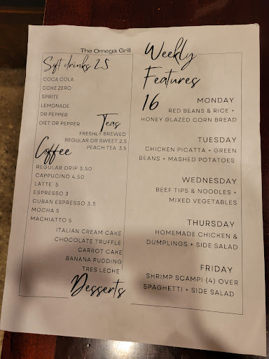 Read moreTucked in a strip mall near 45 Feeder and Sawdust, the Omega Grille is easy to get to, with plenty of parking and a pleasant atmosphere. Sawyer greeted me the minute I walked in at about 1:30 PM on a Thursday afternoon. I motioned that there was only one in my party and she advised I could sit wherever I like. There were probably four or five groups of people in the restaurant dining. I sat down and promptly ordered the fried zucchini, which was why I came in. When Sawyer advised that they did not have that on their menu, I corrected her saying that I just saw it on the menu from my car. She responded with a cheerful smile, “Oh, that would be the Olive Oil, just a couple doors down. Same owners, different restaurant.” Since I was here already, I ordered the tomato basil soup, and if she hadn’t come to take my empty bowl, I would’ve been licking it clean. It was that good. The croutons were perfect. The shaved Parmesan melted into the soup and provided an appropriate number of strings expected when cheese is added to hot soup. As I prepared to pay for my $6 of savory deliciousness and readied myself to walk down to the originally intended destination for fried zucchini, I stopped a couple of gals leaving and asked one if what I saw her dipping into her soup was the Rueben. “Oh, no”, she replied enthusiastically, “I always get the same thing; the grilled cheese and tomato basil soup”, pointing to the menu still on my table. She described what she had just eaten with joy, adding that “It’s the best grilled cheese ever; very special; they add sliced avocado to it.” Her dining companion continued, “I always get the Greek salad and it’s a hit every time. The chicken pot pie is great too!” Well, I couldn’t leave now, but I really wasn’t hungry enough for another appetizer or certainly not an entrée so I asked about the Italian Cream Cake. The response in unison; “Oh, you’ll come back just for their cake!” And I will. The homemade whipped cream on the sides contained a candied pecan and I could have made a dessert of that by itself. George, one of the owners, (with his sister) stopped by my table to say hello and told me they’ve been there about 10 years and that his parents own the Olive Oil a few doors down. He suggested I try the “Sugar Cookie Peach Cobbler” next time and I will, because there WILL be a next time. I still haven’t made it to The Olive Oil for my fried zucchini, but I’ve got a feeling I won’t be...