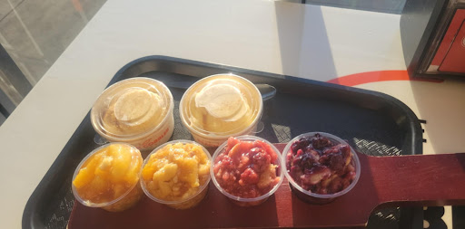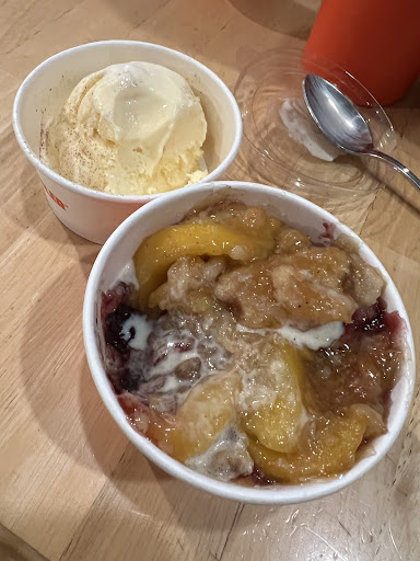 Read moreThe Wait: There were eight people in front of me in line. From the time I got in line to the time I got my peach cobbler and ice cream, 28 minutes had passed. At one point while I was waiting for my order, there were 11 other people waiting for theirs. The Food: For nearly $9, I can not say it was worth the price. The quantity was fine. The ratio of peaches to crust was fine. The crust was a tad bit too broken up, but not too badly. One of my issues was that the scoop of ice cream they gave me on the side (as requested) was not placed in the contained just prior to order. It was scooped at some earlier time...sat out for a while and melted some....then put back into a freezer. The ice cream was very tough to spoon out since their plastic spoons are cooked-noodle flimsy. As for flavor, the ice cream was typical vanilla flavored. The cobbler had a very decent taste and bite. It was okay at best, but the place is named after it, so it should be phenomenal. It's a far cry from my wife's peach cobbler, but that's the best I've ever had. I didn't expect it to be as good as that, but it should have been far better than it was. It's not bad, just nowhere near $9 and 28...