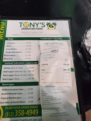 Read moreWe have been eating at Tony's a long time before there was a Pflugerville location. My son practically lived off of Tony's cooking via his food truck in Austin while he was in college at Huston Tillotson University. Past few times we have been to Pflugerville location its been hit or miss. Today's service, and food is confirmation that we will NOT be back. I sent my hubby to pick up a few menu items namely a chicken pattie with coco bread cause truthfully thats just one of my weaknesses. I had my mouth all watered for a fresh chicken pattie I take it out the bag to find what you see in the photo. At this point my husband is willing to drive back to the establishment. Truthfully we don't live close, and I was so disgusted I didn't even want to eat anything else we purchased. I guess at this point my thought process is everytime we eat here we easily drop close to $50.00 or more on our order. This should NEVER be a conversation or issue my food should reflect the money I spend. My husband knew I wasn't pleased and I started looking over our order in a whole all he kept saying was the young man at the register don't listen. Ordered a side of stew chicken with no gravy extra carrots. Got exactly the opposite plenty of gravy 2 carrots, and maybe 3 small pieces of chicken. I mean potentially could chalk it up just being an off day due to holiday and establishment being busy. Just can't bring myself to say this is acceptable!! As stated we...
