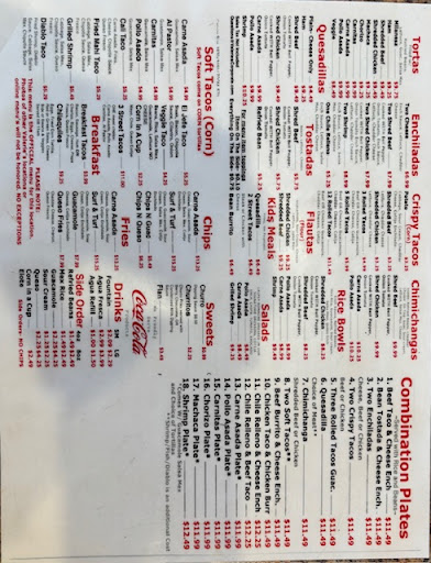 Ā Ā Ā Read moreHard to judge a taco restaurant with nearly 100 choices on the menu based on a visit and eating just two tacos, but, I will try. This is a counter order restaurant with plenty of seating. The restaurant felt a little grungy, but not dirty. It just has a bit of a used look to it. The woman who waited on me to look through the full menu board was patient and friendly. I placed my order and then noticed that there was a small salsa bar over in the corner. Unfortunately, someone had used the same ladle in all three flavors so there was a splash of red in the green and green in the orange and orange in the red. Not the restaurantās fault. My food arrived in pretty good time, but I was also one of only three people in the restaurant. The Pollo Asado was excellent, full of flavor and plenty of filling in the corn tortilla. The Grilled Shrimp was good, but not as good in terms of flavor balance. Again, corn tortilla. It is important to note that they have corn tortillas, not flour. I was asked about flour and told no. So, overall, good experience, good pricing, canāt judge how they would do in a crowd or rush because the kitchen looks pretty small. Salsa bar is a plus. Corn tortillas only is a minus because I have lots of friends who just prefer flour. If I could give 3 ½ stars I would because it just doesnāt quite make a 4-star experience for me. I will return and try a...