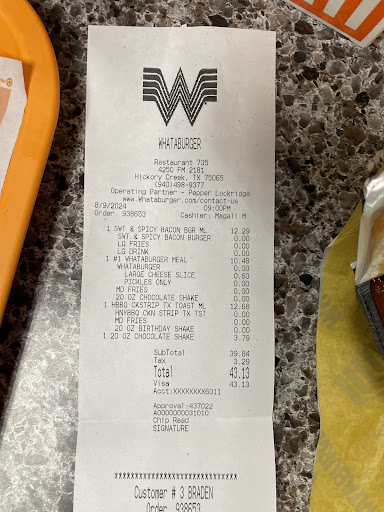 Read moreThe quality and level of service at this location has taken a nose dive lately. More often than I can count, people will be waiting to have their order taken at the drive through for an insane amount of time when there is no one at the window or in line ahead of them. What I suspect, because it's happened to me, is they tell them they'll be with them in a moment and then seemingly forget they are there and just never come back to them. I have witnessed them service line B when line A had someone waiting at the speaker. The food has gotten to the point that it's not worth the price they are charging now, which is a shame because Whataburger used to be my favorite.