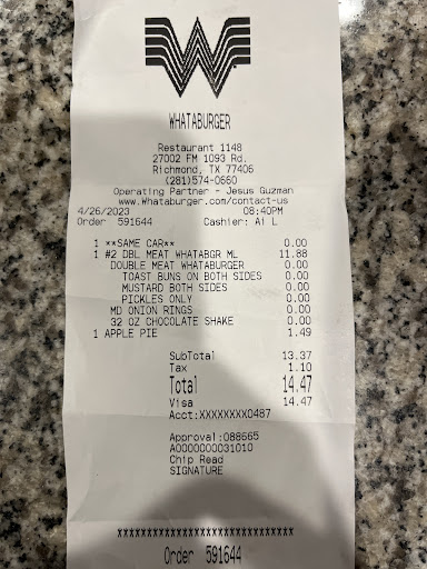 Ā Ā Ā Read moreI would give a zero star rating if possible. After working a 12 hrs shift last night, I stopped on my way home for dinner for me and my better half. I ordered 2 #1 combos, both with mayo, lettuce , cheese and grilled onions and dr.pepper for the drinks. I was only person in drive up, then someone pulls up behind me, they ask me to pull forward because the guy behind me only ordered a shake... so i do... 20 mins later i still have no food... so i go inside only to find out my order has been sitting there!! I get all the way home (20 min drive) to find out that not only are my drinks filled half way but , I have raw onions on both the burgers, and as my better half bites into the burger on the second bite there is a big piece of plastic in her burger. So I paid $20 for poor service, cold food, wrong food and PLASTIC in the food. I called the store the next day(today)... spoke to manager ( jeremy) to be told oh I am so sorry, what do you want a refund or order remade. I asked if he wanted my order # or time off my receipt so he could look into it and he stated no that he didn't need it. What!! It just really shows what type of management is running the place and why this location is a pathetic local that gives whataburger a bad name. I will never spend another dime here!! There are other option around that will respect a person spending money on their product. Give us a zero rating...