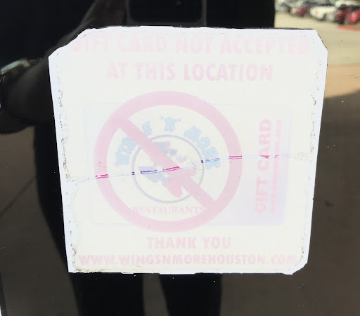 Read moreNot worthy of Wings & More logo...stumbled upon location seeking to use a gift card. First red flag as walked in was when asked if I was looking for Subway. Should I be? Got ready to sit at the bar until told there isn’t one. Flag. Ended up seated in tall booth, resembling an office cubicle. Took 15 minutes before server finally approached & took order. Couple tables of teenagers nearby but otherwise pretty empty for lunch time. Another flag. Finally got my wing basket 30 minutes later - 1 drum. Flag! Fries hot & fresh so there’s the 1 Star. It’s now been more than an hour, and as I seek out my server for the check, the manager walks by my table a few times inspecting the area, but not 1 word to me about my meal, my visit, or the service. It was noticeably awkward. Offered my gift card to pay check & told GCs not accepted. Same manager explained they couldn’t accept it because they were a franchise. Aren’t they all? Realizing that wasn’t a good explanation, he resorted to saying they have a sign at the front door. Pic is attached. Now how did I miss that? 🙄 Final flag and I won’t be back! It’s not so much the gift card as it was the manager’s complete lack of customer service. Too much competition to tolerate. I’ll be across the highway with everyone else at...