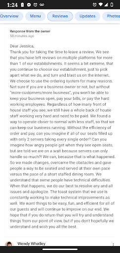 Since there is no response option, yes... I have eaten and chosen to eat at ALL of your restaurants.My husband and I love trying new places. One of our favorites is Indian Fields Tavern. As a local guide and a very HONEST customer, I find it very important to tell others my feelings about each place I visit and if there is consistency... I went to colonial kitchen before it was Martha's, and it wasn't good either. I have been to the Blue Crab in West point, and both times I've gone I've been disappointed because others have said they love the food. Everyone experienced the same things that you did during the pandemic however I never stopped going places and I didn't experience some of the inconsistencies and poor service and lack of customer concern as I did at the restaurants that you happen to own. That is not my fault. As a matter of fact I was at the Trojan grill the other night when one of the owners was taken down decorations. There was a horrible malfunction with the system and my husband and I waited for our drinks for a very long time. The waitress then had to go and take our order by hand. The only saving grace for that place is the pizza it's very good. Nowhere else in New Kent with the exception of Antonio's has good pizza. So if you were looking for some praise there it is you have great pizza coming out of Trojan grill. It was disappointing when that was taken away for a big portion of the summer. I would say not to lean on the pandemic as a crutch for things that you could be doing better, everyone has suffered the same but their service and their food quality has not. I have tried to reach to you by email and I've had no response. Each of your locations has a very good ambience. Most of the time the servers are great. The bar at Martha's puts out exceptionally good drinks. The bar at the Trojan grill does not. I could go on and on because I've been a customer who has came back time and time again in hopes that something would be better. I honestly found your response to be very careless, even though you changed it, I've still posted it here. I wanted to give small business around here a chance. That's why I kept coming back. Yes, I've reviewed you on Facebook and Google. Common review platforms. I'm truly disgusted by your original response and therefore I will no longer make the suggestion to visit any of your locations to myself my family...