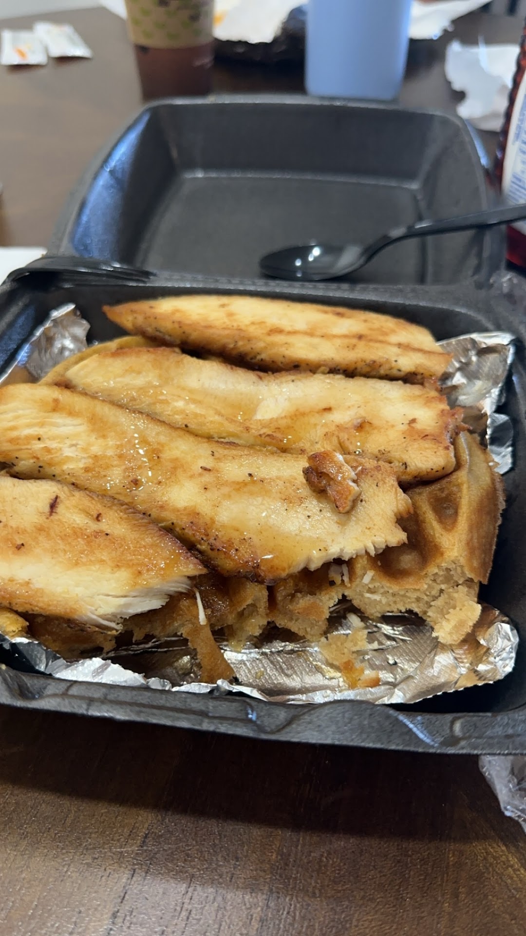 The chicken and waffles were immensely disappointing. Grilled chicken instead of fried, only 3 slices that maybe were half a chicken breast total, and bites that felt undercooked. I’m astonished that you can serve that little chicken and not cook it through. Very little flavor in the chicken itself. Saving grace was that the waffle was crispy.