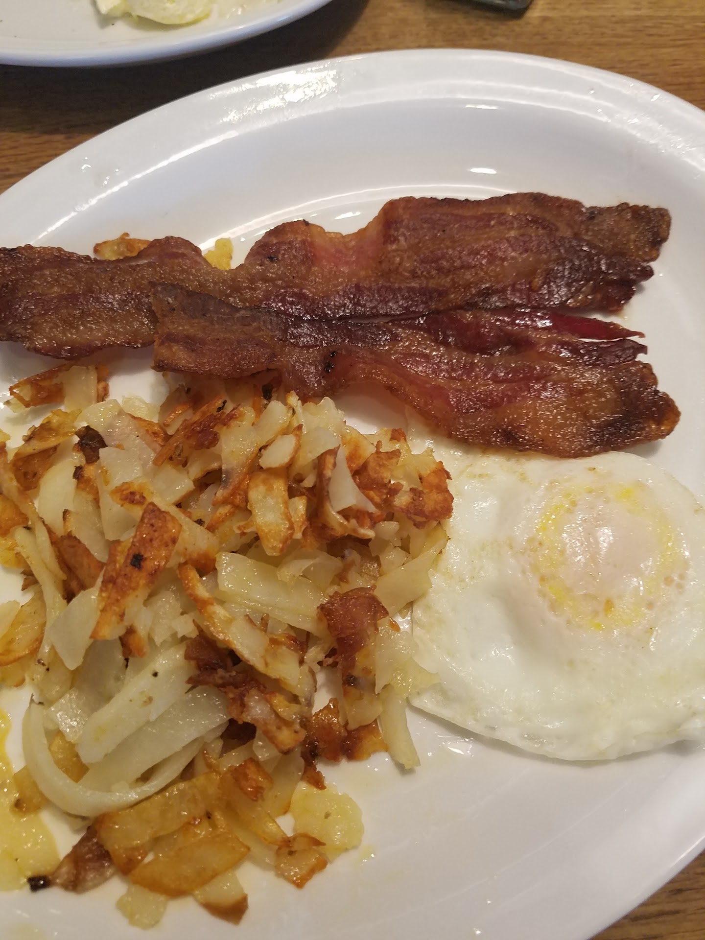 The food was good and the portion sizes were very large. The bacon was good, but some of the slices were mostly fat. The hashbrowns were crisp and fresh and the large biscuit was delicious (deciding on whether to use the gravy or apple butter was a challenge). The blueberry pancakes are magnificently huge, but unfortunately we saw no option to order them as a side or with any other items. They were delicious, but not the most memorable.
