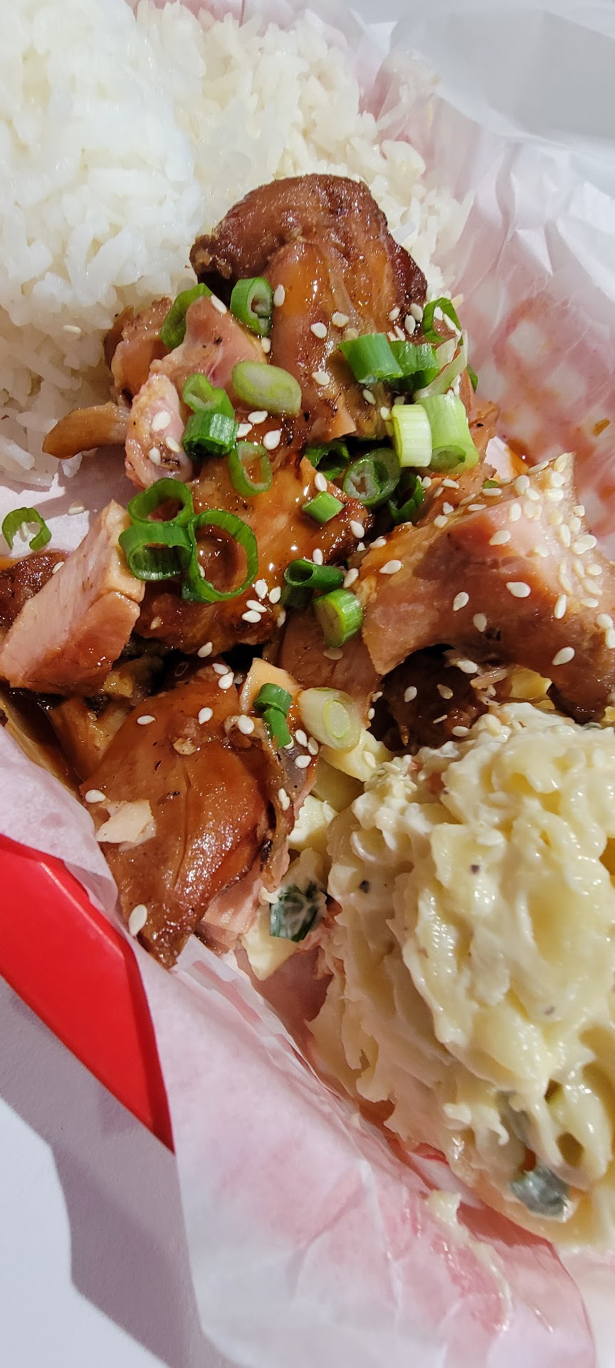 The Huli Huli Chicken was not traditional. It was chicken thighs with a marinade or sauce over the top. It was tender and tasty but not Huli Huli Chicken. It was more of a BBQ chicken plate you'd get at an L&L in Hawaii. True Huli Huli is on the bone and simple salt pepper over a nice crust on the chicken skin (some variations) the Mac salad was on point. (but no shoyu available) the rice was on point in terms of texture, but they use Jasmine rice. We use Japanese shirt grain style (usually the California crop)
