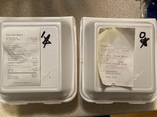 When I got in the car I checked the order and everything seemed correct, expect it was a full order of Thai fried rice with 0 spice instead of a side order. I looked at the receipt and it shows I paid for a full order so it wasn’t a big deal. One box was label as 1spice the other box labeled 0spice.