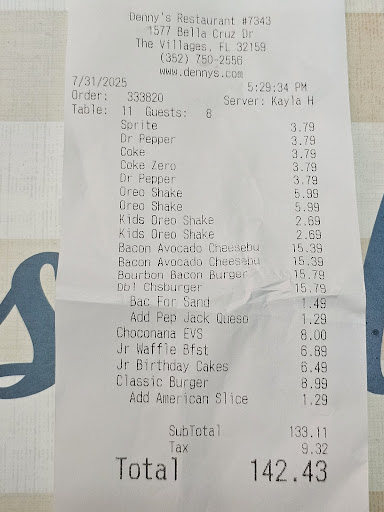 Passed by this Denny's and saw the neon open sign... thought I could use an omelette and some hash browns and pancakes... walked in...sign said " please wait to be seated"...so I waited by the sign at the "hostess stand...I saw 2 employees on their phones, and 10 minutes later when a "regular" customer walked in (drove a black jeep)...he said to me, "you've got to seat yourself, otherwise your going to be standing here forever"... He walked into the restaurant, was greeted by an older skinny female employee that was seemingly happy to see him. At 1:30am I would have expected the servers wanted to make tips ..I guess not at this location... I'm ashamed this restaurant is so close to the villages....disgusts me. I would never attempt this place if I were you... Waffle House is right down the street with comparable food and prices...It doesn't take a rocket scientist to fry a freaking 🥚... 🥓... sausage... Waffle House will serve you immediately...they announce your arrival and greet you immediately. Thanks Waffle House for making me see the error of my ways in going to Denny's. Moons over my hammy used to be a favorite when I first started going to Denny's (30 years ago)...now they are "MOONS" away from serving "HAMMY" to anyone they don't see as a regular. Tough break Denny's... At Waffle House ,(1/8 MILES AWAY )...#7 ( with a side order of sausage and bacon and double hash browns were...