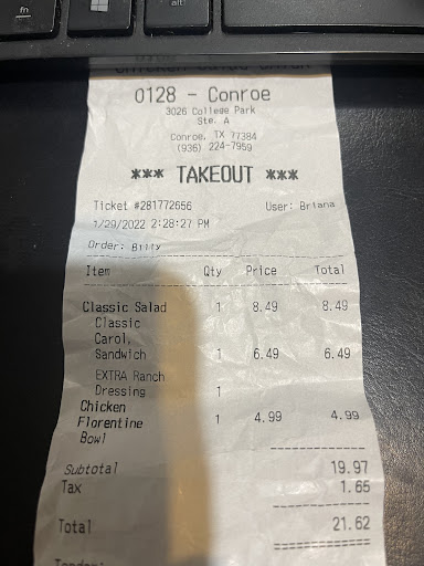 Read moreI love this place. I do not have one near me but when I do go near one, I make it a point to stop and eat there. I got take out at the Pasadena TX. location 2 weeks ago and they never asked me if I wanted lettuce, tomato, and pickles in my sandwich. But when I stopped to eat at the Woodlands TX location, the young lady did ask me if I wanted lettuce and tomato and I really appreciate that she asked because I do love my sandwich with lettuce and tomato. So please ask if we would like those when we go eat there or go through the drive through. If I had to say something negative about the Chicken Salad Fancy Nancy, which is my favorite, I would say to add more grapes to the sandwiches. Because on my visit in Pasadena, TX, my sandwich did not have any grapes in the chicken salad. And the one in the Woodlands, there was only 1 grape in my sandwich. So don't hold back and limit the grapes please. I love the broccoli salad, it is so delicious!!! I love the cookies, they are so delicious. The kosher pickle on the side is a nice treat as well. I did enjoy the pictures hanging on the...