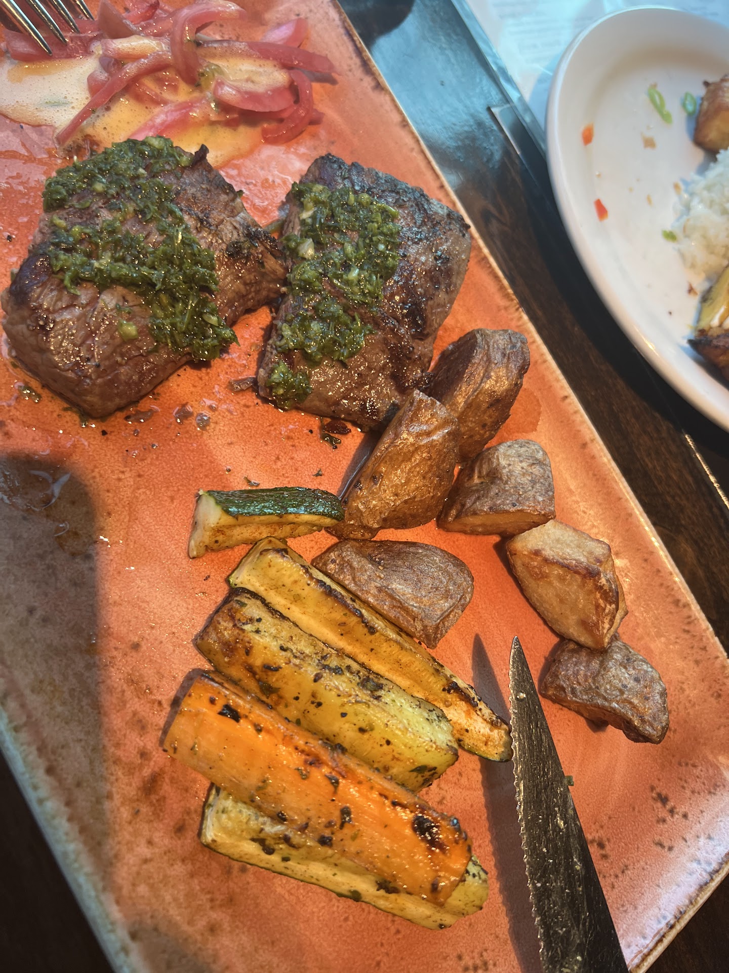 Dinner was the owners cut filet mignon served with jalapeƱo risotto and a mushroom Foi Gras and the ribeye served with asparagus and mashed potatoes. First up the filet mignon!! I ordered it medium and it had the most wonderful crusting and was melt in your mouth amazing. Paired with jalapeƱo risotto which was so creamy and bursting with excellence I mean it wasnāt to spicy but it complimented the filet mignon so well. The entire dish was TOP TIER. I had a bite of the ribeye and like the filet it was prepared medium and it was absolutely perfect. The asparagus had a nice smoke to it and it was huge Iāve never seen asparagus that big and also I would eat it again and Iām not really a fan. Now the mashed potatoes were just mashed potatoes nothing special about themselves if you can sub out for jalapeƱo risotto DO IT. Lastly we ordered a side of the rum plantains and Iām a HUGE fan of plantains and I was looking forward to the sweetness and rum but sadly they were underwhelming. Whatever was drizzled over the plantains did not add to the dish nor could I taste any sweetness or rum. The drizzle had a bit of a sour taste. If I order again Iāll ask to leave that part off but you might like it that way so give it a try.