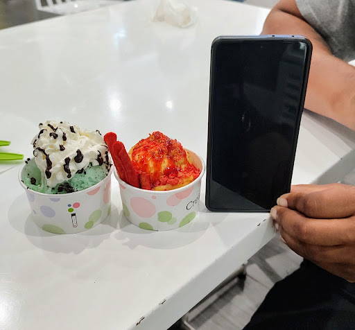 Read moreLiving in a time where social media has made everyone think they're culinary experts has gone overboard. As a result, there are a multitude of businesses springing forth of no real substance and delivering less than subpar products. Needless to say, this establishment is one of the many. Overpriced, tasteless, poor quality "visually appealing" cold desert is what you're in store for here. Choose your base (dairy/non dairy) and either create your own or pick from their line up. I chose the mint chocolate in non dairy form. The mint taste was almost non existent, the chocolate chips sprinkled in just a couple spots were low quality and waxy. Whipped topping tastes like foamy sugar water. And there's only a light dusting of cookie crumbs. ONE scoop of ice cream. All for appx $9 bucks (see pic.) It was horrible and my partner didn't like his either (mangos & takis.) Which was spicy unbeknownst to us bc we didn't realize those were takis on the pic. So he switched to the banana/strawberry combo. That was horrible as well. It was thrown away after we left. Tables were extremely dirty, chairs in disarray & floor needed attention. All 5 employees remained behind the counter laughing & talking. I cleaned a spot for us to sit. Bridgette was the best part about this 1st and last visit. $21 bucks for 2 scoops of tasteless ice cream with super minimal cheap toppings is such a slap...