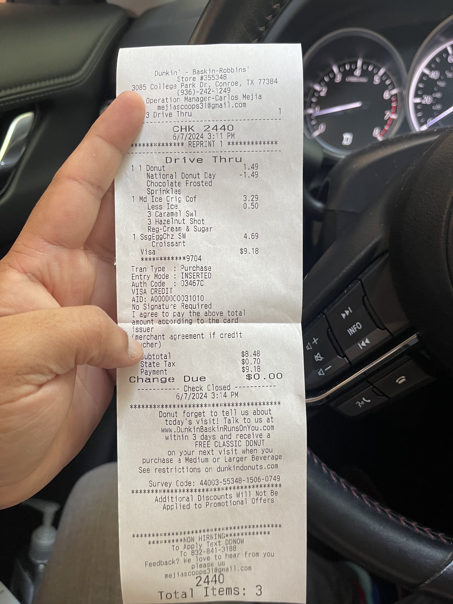 It was the first time my daughter and I decided to try Dunkinâ Donuts before school. I always get her breakfast before school. Never have I ever had to drop her off at school with ni breakfast and then go back for a refund. First, I adore sour cream donuts. I was told it was pretty goid. It tasted like a grease ball. We couldnât get the muffin wrapper off the blueberry muffin enough to eat it properly. The 2 sourdough egg and bacon sandwiches were so dry, I as an older woman almost choked trying to get my first and only bite down. My daughter literally actually scratched her lip from the dry crust of the bread. Because it was her breakfast she attempted to eat it, but couldnât. The hash browns were soggy and tasted like old grease and left my mouth greasy with a bad taste. My daughter did happen to keep her iced coffee because itâs all she could salvage and needed a drink to have during school. When I returned the food for a full refund the young girl, that already had an attitude when we made our purchase, rudely told the manager we had a coffee I wasnât returning. I told the manager that I expected a full return because of having to drive back to the store. The manager, who looked half awake, told me it was âtoo early in the morning for all of this.â I got a refund less the iced coffee. Which I was mad about because you shouldnât have to drop your child at school with no breakfast and drive all the way back because the food was so disgusting. For him to not give a full refund considering this is truly a sad way to handle a customerâs complaint that had returned their entire order, but I guess he needed to impress the girl with her bad attitude that was sure to pop off and let him know I wasnât returning it. She too also looking like she had no sleep. If they think itâs too early in the morning âfor all of this,â they need to check themselves because what it is, the s itâs too early for a customer to drop her daughter off at school with no breakfast then turn around and take the food back instead of typically letting bad food you spent your money on slide for what it wasâŠbad food! At least itâs not too early for me to take the time to write...