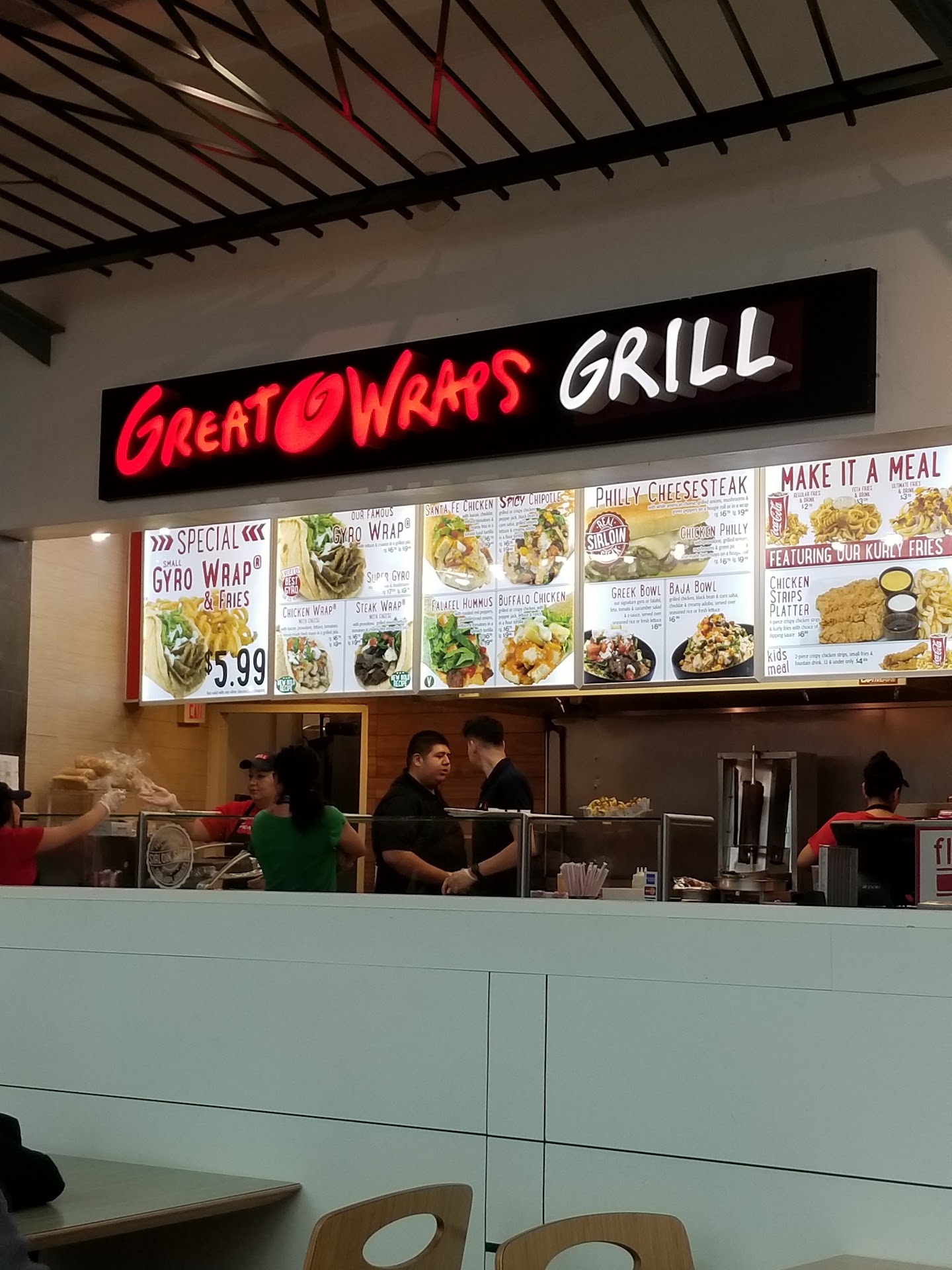 Inside the Woodlands Mall food court on the second floor. It can be hard to park around the mall on a busy day. There is valet parking towards the water Wayside. the food court is a large area and there are many restaurants to choose from. The wraps are very good and they offer free samples. I think they taste fresh and they offer a good value for the money. Saturday and Sunday are very busy in the mall. It was my first time here and I will come back again. I highly recommend it to anyone. Try a free sample first if you're not sure. There were plenty of available tables and they are cleaned very well quickly. It's a very clean-looking area and feels very safe. There are some nice window view tables on the other side of the carousel. Many malls are not doing well business-wise. Please try to shop at this one as much as you can. It's a nice mall and all of the stores appear to be occupied and open. Let's try to help them out. Also as a fun adventure is the free Green Street Car trolley that has about a 30-minute ride around the town center of the Woodlands. It is right near the valet parking. I would advise a walk along the water way and then when you get tired you can ride the trolley back to the mall. Leave a thumbs up if you like my...