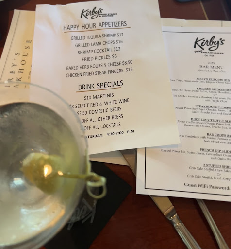 Read moreKirbyâs steakhouse HH in the bar is the best! The service from Alison and others which in the past has also included Justin and always includes greetings from the kitchenâŠClarence and staff are the absolute best at getting the best flavors out of the featured items! The dirty martinis with mixed plain and blue cheese olives is my âgo-toâ yet my SIL had a sweet cranberry one that wow if you like a martini with a splash of cranberry then go for it. We were celebrating my 45th bday and Kirbyâs didnât disappoint! We started with the stuffed shrimp (bar menu) and mostly eaten in the pic because I forgot to take a pic b4hand with this amazing b something sauce (kinda lemony wine cream) yum! Then fried pickles with yet another yummy sauce. And of course the tender grilled lamb chops (HH menu) (yup you got it another amazing sauce), baked herb Boursin cheese (HH menu-fresh roasted garlic cloves - only order on a 2nd date or up or you may turn your date away with your breath haha) delicious! Soy sauced sliced beef (bar menu) I think with a chimachuri sauce thatâs great; meat so tender and buttery! Steakhouse sliders (bar menu but had ordered the French dip sliders but didnât disappoint) very flavorful and fries cooked perfectly as well as raw oysters where I mixed the cocktail with the pesto EVOO or whatever with extra horseradish that again was Amazing! And fresh bread with plenty of butter to soak up any of the sauces mentioned above just because they were all so good! Ending with the bourbon pecan pie with a great flavored ice cream that we all shared a bite (or 2!). The lighting at first was dark yet naturally lit since the sun was still up at 5 but by the time we left around 6:30pm it was darker, it could have been lighter but I guess if we had kept our candlesa d not âshooâd them away it would have been lighter) but we ordered so much food for our party of 6 we needed the table room. However still a 5...