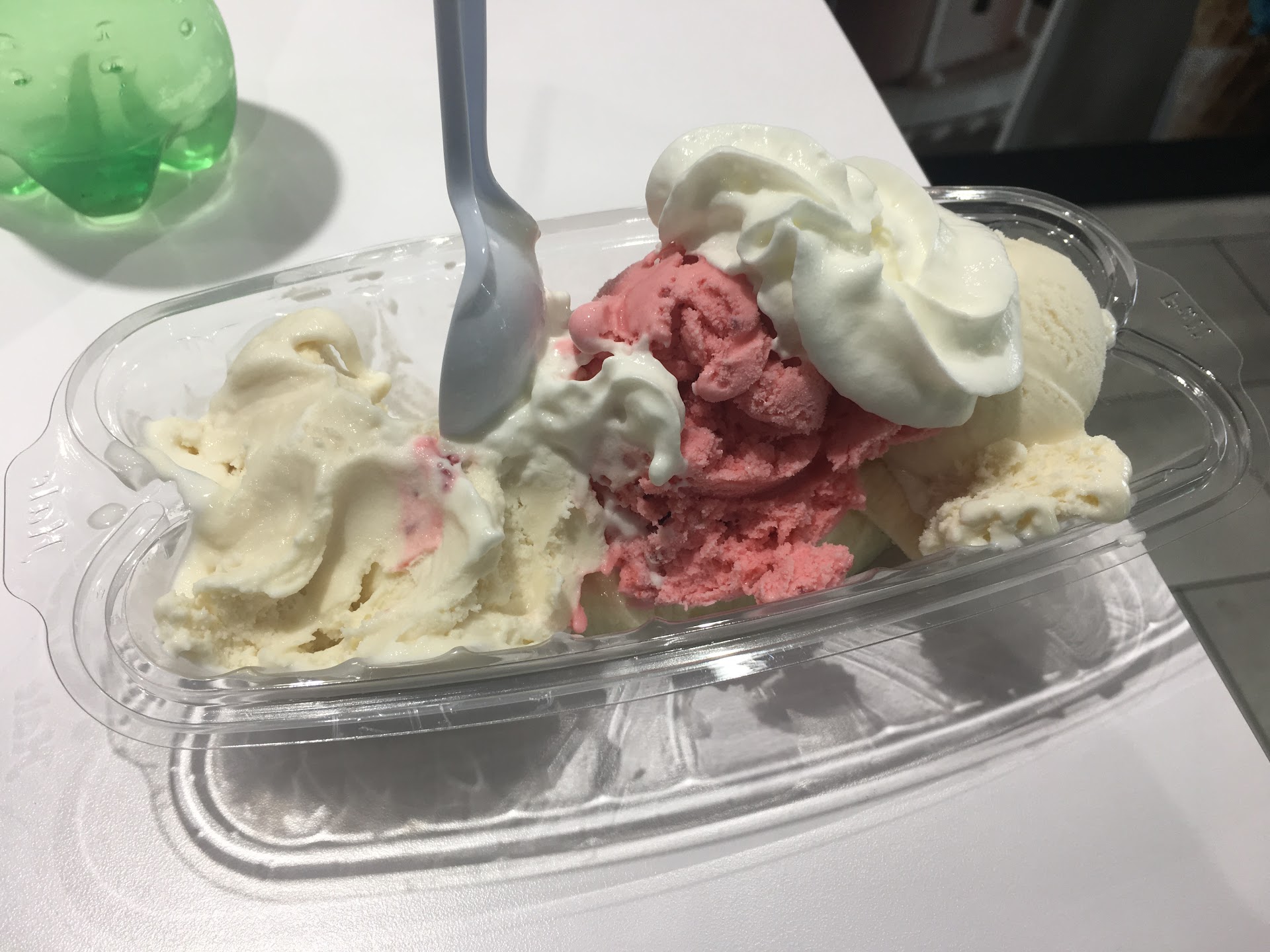Every time I've tried to order a banana split they said they're out of bananas. Store is next door to Kroger, worse case scenario. This time they have bananas I ask for a banana split. I asked for two vanilla scoops and one strawberry. She puts a banana in the middle and puts the scoops on top pops on a spoon then hands it to me. I ask can I get whipped cream or strawberries?? She pours whip on top and turns to the older girl and asks if they have strawberries. She replied "yeah, but you have to cut 'em." So she hands it to me and says they're out of strawberries. I ask for pineapples?? None of that either. As the other girl comes to help her ring up she says it's a banana split and the other girl even asks where is the banana?? This is my $6.99...