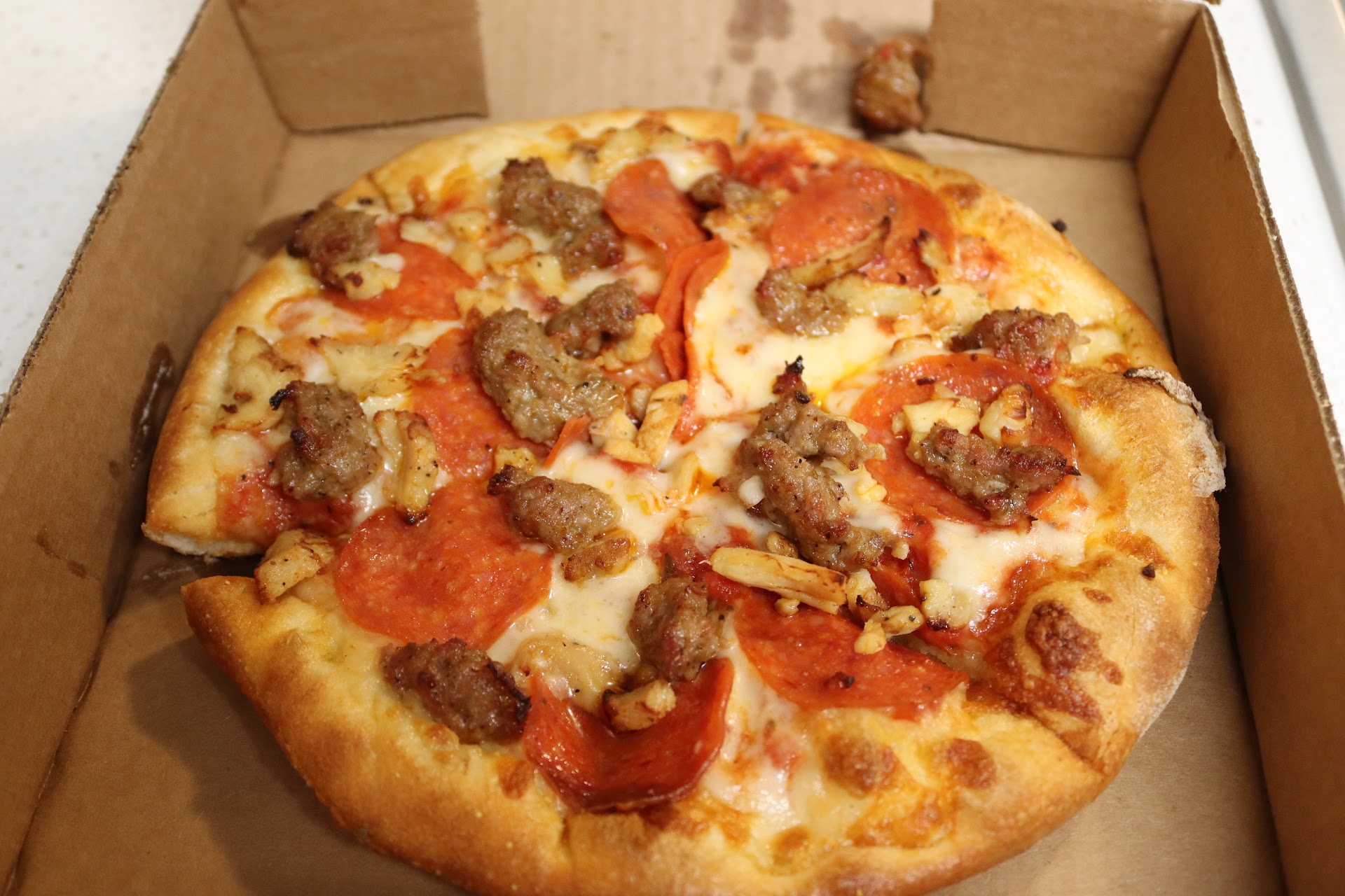 Now the quality of the pizza was horrendous. As you can see in the photo, the pizza was soggy and undercooked, with a complete lack of cheese. The sausage was sparse and the bacon got plopped in one big spot. The crust didn't even rise, and had a pre fabricated spongy texture. The sauce tasted too tart, almost sour, and there was too much.