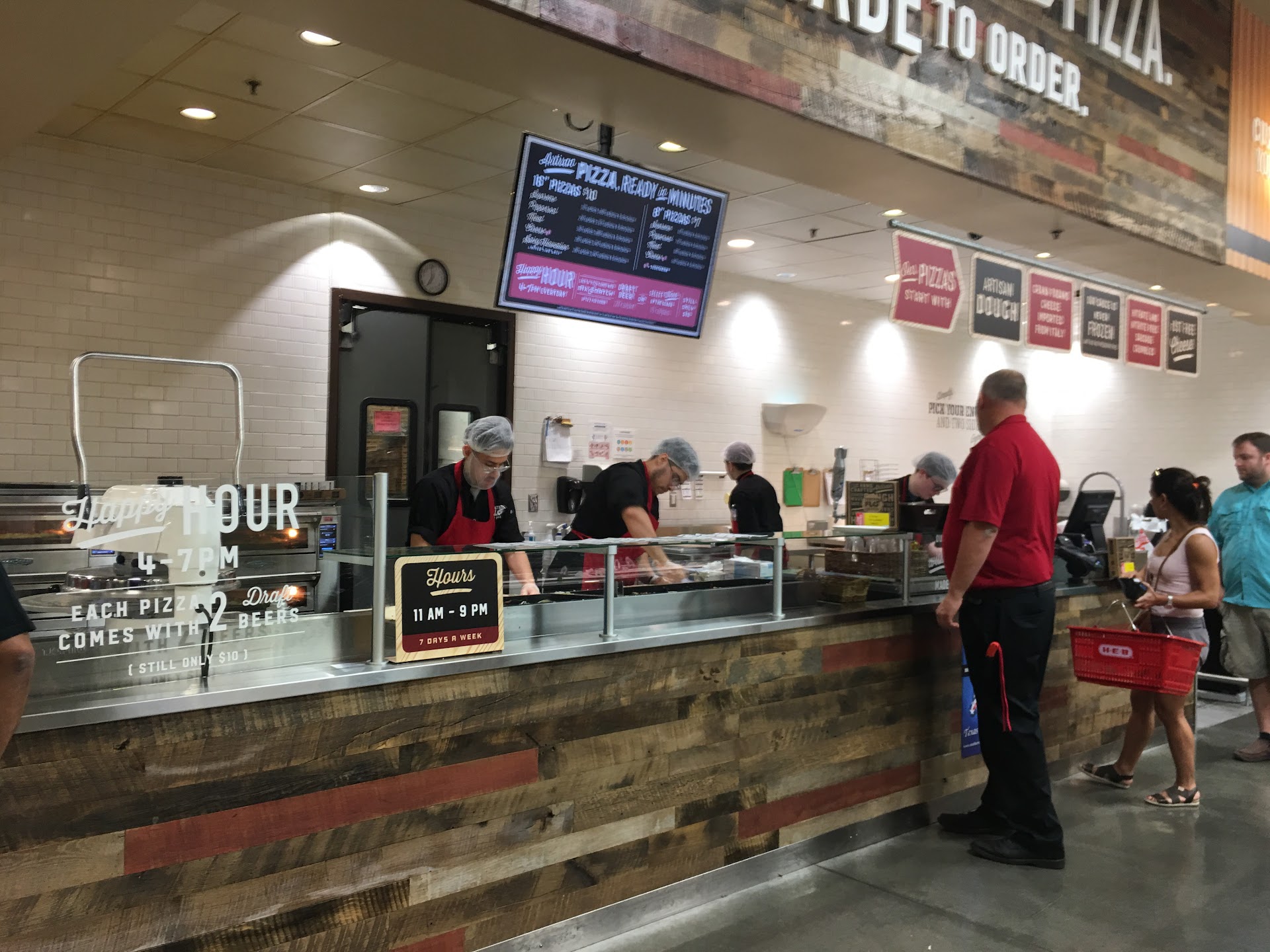 Suggestions to make South Flo even better: Add a monitor that shows customers names whoās pizzas are done. Right now they only call the persons name and after that, the customer has to interrupt their flow and ask if their pizza is done. Sometimes customers place their order and then grocery shop, so having a monitor with their name would help the guys focus on making more pizzas without interruptions. They need to add a bar/tvs next to the pizza counter so people can hang out and drink their 2 free happy hour drinks. This is bringing so much business for HEB, they should definitely double down. Something like Whole Foods at Hughes Landing is doing.
