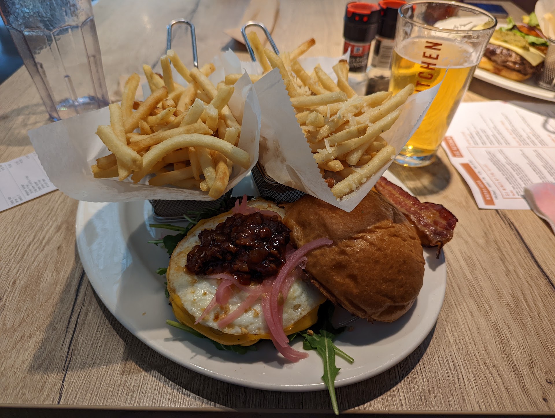 Read moreI visited here with my friend on 05/06/2022 and I would like to say first the food was fantastic and the staff overall were great with helping us to figure out what to do . I got the Hangover burger with an extra side of parmesan fries. I also tried out a beer from 8th Wonder brewery since they had an event with them. Now we came across two issues. First we got up to get some desert and my friend wanted to get a drink. I left my drink and the side of parmesan fries. While we were ordering they bused our table. I spoke with Austin and he was got me a new beer since I had asked and it was what I really cared about. Now when I ordered the drink I had ordered a Lava Cake with ice cream. I was told it would take about 10 minutes. After about 24 minutes of us waiting and my friend had already gotten their drink I got up and asked about it. Apparently they forgot about it and it was never started. So I went ahead and ordered a to go order for my mom. It was the Thai Peanut Chicken Wrap. There told me it would take about 10 minutes. I was like cool. I should get it then get the wrap. Well after another 10 minutes I don't get anything. A little bit after someone comes and just takes the number. So I end up getting it back after they ask what I was waiting 45 minutes on. I let them know. Then shortly I get my to go order. Finally I get the lava cake. It was also pretty good. I did go during happy hour to be fair and towards the end they were getting a bit busy, but I am very conflicted with how I feel about the restaurant. I do not know if I want to go back. I do want to give them a second chance, but I have no decided whether I will or will not.