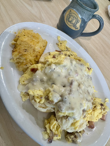 Read moreI had a really enjoyable breakfast here! I liked everything, from the quality of the food, the wonderful staff here and the prices are very fair! The atmosphere and the decor of this restaurant is pleasing and fun. On arrival, we were greeted by friendly staff and seated right away, even though they were very busy. The staff brought us our menus and took our drink requests bring us coffee that was freshly brewed. After looking over the menu, my wife decided on blueberry pancakes and the waitress recommended to me the favorite standard eggs, sausage, hash browns and sourdough toast. Both of our items came out very quickly from the kitchen hot and delicious! The pancakes were a stack of three 12-in very fluffy Flapjacks with loaded with fresh plump and juicy blueberries. The one thing that always makes a restaurant unique is that they bring out warm maple syrup instead of room temperature. I think warm pancake syrup always taste much better! On my plate, my eggs were scrambled, the sausage was perfectly seasoned (and probably some of the best I've had) and the hash browns were unique because they are actually from a casserole and not just fried on a greasy grill. You can really taste the love and quality in those hash browns. The sourdough toast was also really delicious and thick cut slices, just like sourdough should be. The prices here are very reasonable and you can anticipate about $18 per person for a plate of food and coffee. The staff keeps the dining area clean and tidy. And all of them are very attentive and have fantastic attitudes and make you feel welcome. I definitely give the Toasted Yolk two BIG thumbs up and recommend this is a great place for breakfast! The food, the quality, the service, the staff and the overall experience really made it enjoyable and relaxing! I will definitely be coming...