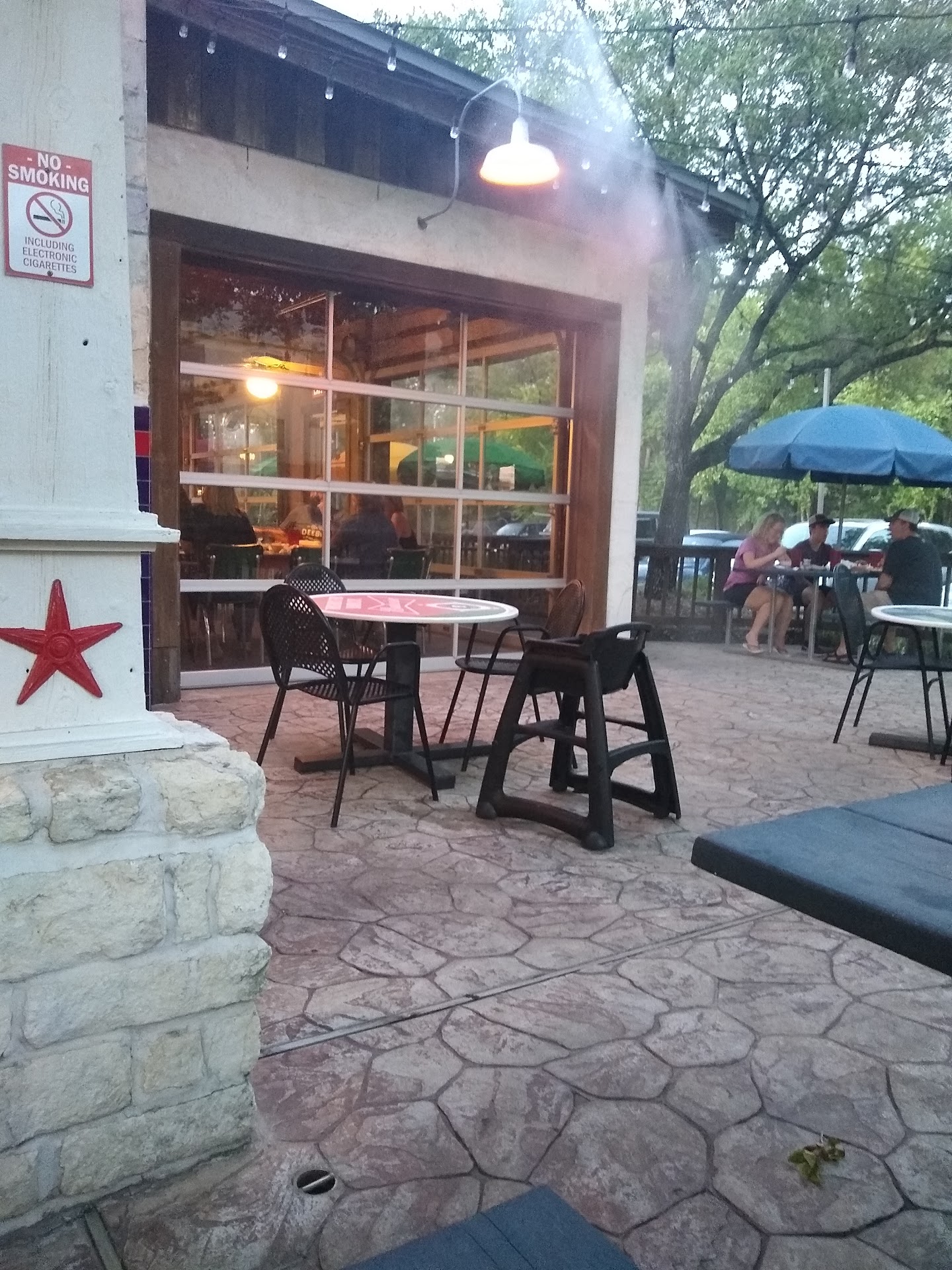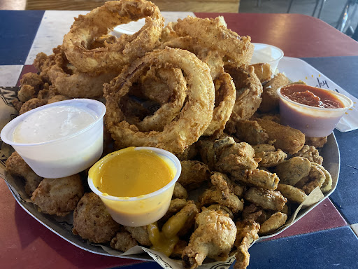Read moreWe are new to the area and were running errands in the area, got hungry and stopped here for lunch. We had seen good reviews and are looking for new local favorites. The exterior was inviting with a large covered patio, plenty of seating, and lots of décor. We thought this was a full sit down restaurant, however, you order at the counter before seating yourself. It was a bit confusing when and how to pay, but it seems you order with one person and then pay with the next person and then sit down. I was really wanting something light and fresh, which was hard to find on the menu, so I sucked it up and we ordered the sampler, I had the patty melt with street corn and my husband ordered a bacon cheeseburger with fries. So, the sampler was intriguing because it would allow us to try a bit of many of the appetizers, but omg, this thing is huge!! Maybe we should’ve known at around $16, but goodness, lol if we would’ve ordered this for our meal and nothing else, we still wouldn’t have been able to finish it! However, the sampler was delicious! Everything was fried, but the mushrooms, jalapenos, onion rings, mozzarella sticks, and pickles were mouthwateringly good. The breading was light, nothing was overcooked, the onion rings were huge, and there were 4 cups of dippers (2 ranch, marinara, cheese sauce). So good. We’ll bring 11 of our closest friends to share it next time, but will definitely have it again. We took 3 boxes of leftovers just from the appetizer lol. The burger and patty melt were cooked as ordered and tasty. Our drinks were refilled regularly and the serving staff was very friendly. Not the place to visit if you’re looking to eat healthy, but definitely good comfort food, fun atmosphere, and...