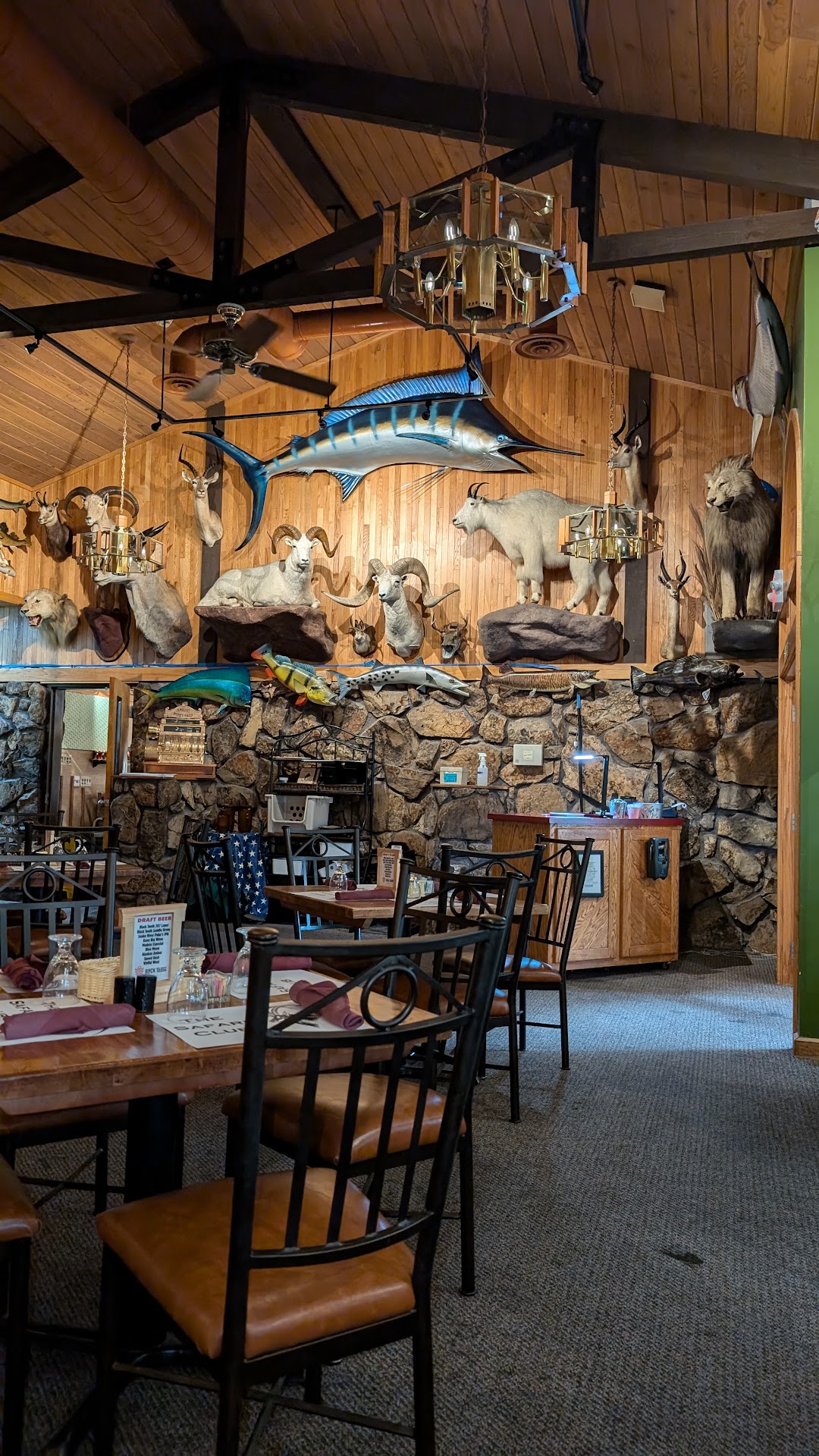 As for the food I figured if I was going to eat at the hunters palace I better get the 14 oz prime rib with the stuffed baked potato. With a place like this you know the meats going to be good and the veggies are going to be lean. Driving 100’s of miles passing 1,000’s of cows who would ever dare to get fish?! Get what you know is going to be fresh the ocean is 1,000’s of miles away!! I got the salad and it was iceberg with a few small tomatoes, peas, celery. I hadn’t had veggies in a while so it was nice. The prime rib was good and soaking Ajou to keep the meat moist. The stuffed potato was brimming with real thick fresh baked bacon & cheddar cheese. There were no veggies included on the plate just a big slab of meat. OH! We also got the cheese curds and they were awesome! Unfortunately all there good wines from California were out of stock. My wife had the Malbec wine for $5 a glass and she was happy enough. My 4 yr old daughter had the spaghetti and meatballs. It was an adult sized side dish for $5.00! All in total 2 prim ribs, 2 glasses of wine and a spaghetti was $107 with tax; great deal for how much food we ate and had to bring home with us. Looking at other patrons plates it I noticed they were all brimming with food Black Bear Diner style. So if you like American style food surrounded by animal trophies than this is the...