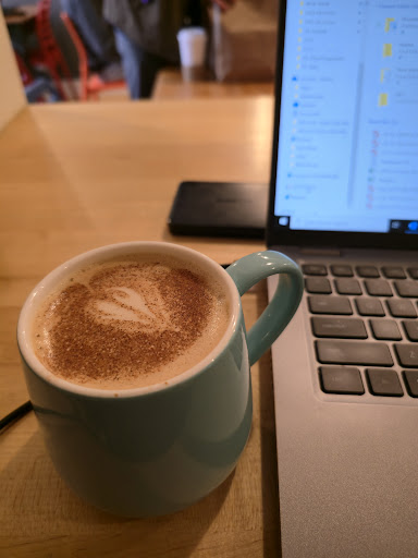 Read moreI came here to plug in for a couple hours and grab a coffee while passing through the area. It's a good-sized space with outlets and WiFi. It's a solid work space and it seems like the locals feel the same way. They have all the essentials on the drink menu, but I went with one of the seasonals. They made me a hot dirty pumpkin (chai + espresso + pumpkin) even though it was meant to be an iced drink. Flavors came through well and it had a good amount of spice. It was a little on the sweet side for me, but it was a solid drink nonetheless. They have oat milk and no almond milk for the ND folks. They also have a full food menu of bfast and lunch dishes, too, and everything coming out around me looked...