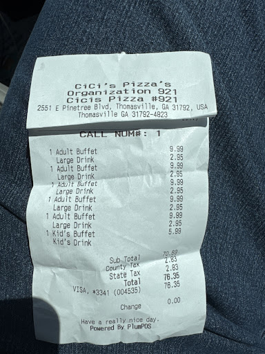 I took my kiddos to Cici’s (Thomasville) yesterday and we had such a great experience! The dining area was clean and we felt welcomed from the moment we walked in. I noticed staff were consistently tidying up the buffet, & keeping the arcade equipment clean as well.