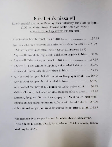I personally had a very fine experience with Elizabeth's on main last night...6 of us drove about an hour away to support a friend playing guitar at the newly opened Average Joe's tap room. Joe's does not serve food, so we opted for take out from Elizabeth's. Purchased two 16 inch pies, and a personal 10' for the youngest of the group. So It's Saturday night at 6:45. What looked to be the matriarch of the establishment was extremely friendly despite a full restaurant and everything that comes along with that swirling around her. Multiple tickets above the grill made me at least think for a second; "this might take a while" or "this order is bound to be messed up in some kinda way"---Oh well, we'll see...Got my order in just before 7, it was brought out at 7:20...what seemed to be the expediter (25-30 year old with glasses) was on his job throughout, making sure ticket numbers were connected,... with takeout and in house orders coming out of the kitchen on pace. I explained our circumstance of eating at another establishment and they made sure I left with plenty of disposable plates, flatware, extra napkins, parmesan and garlic salt. The building itself is a fairly small place, and has been there a long time, so there's only so much paint you can throw on it. Overall I would easily return if I'm ever in the Thomasville area again. Pizza was excellent as was the service. Having worked in restaurants and catering, I would urge people who write bad reviews to always consult with management when things go awry, most establishments WANT you to get the right order in a timely fashion, they WANT things to go smoothly and will often accommodate LEGITIMATE concerns.(translation: most everybody's doing the best they can, try not to be a whiner over small stuff and give...