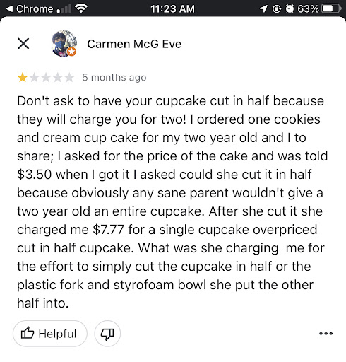 Read moreI ordered the french vanilla or something like that but it was in the wrong spot which was okauly because I just wanted a traditional yellow cake with chocolate icing which is whatbI got. The Cupcake was super dry that I couldnt eat past the second bit. My son got the chocholate one with the cream filling like the little debbie ones at the gas stations. His was a little better but still not the quality of the ones I have had at other SmallCakes. I would have traded the cupcake back in for another one vs left a bad review as I am small buisness owner as well but that day I just didnt feel to welcomed, we stayed and at our cupcake there and staff never asked us how...