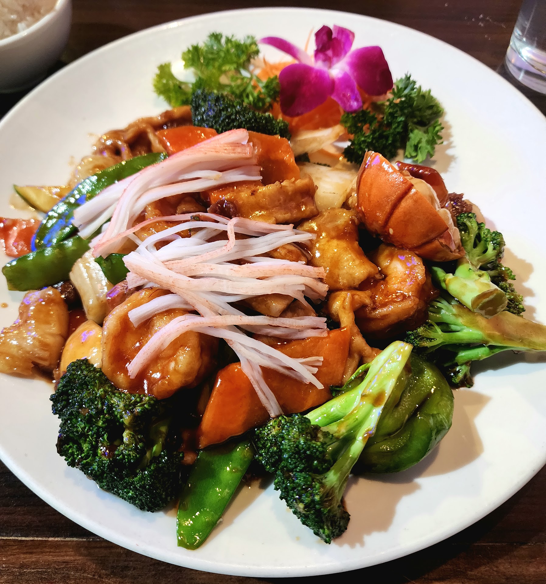 The staff is delightful and more than willing to offer guidance on choosing dishes. We aren't fond of sushi, a specialty there, but there's lots else to get on the menu and we loved what we ordered the last time we ate there. This time, on the advice of our server, we got two new dishes, both terrific and both beautifully presented. Neither one was standard American Chinese fare (though if that's what you like, they'll make it. We love sauteed string beans with garlic and chili peppers and they'll adjust dishes to taste, so that's just what we got.)