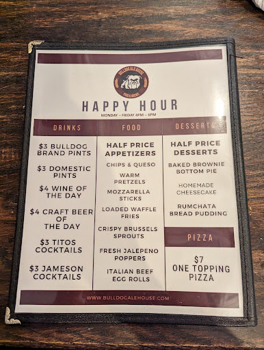 Let me start by saying how much I liked having a dark beer on tap versus the obligatory IPA that everyone seems to be on about the last bunch of years. Getting it on the cheap during happy hour was even better.. Bulldog Ale was very drinkable.