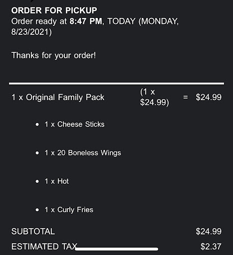 If the people working this restaurant had a tiny bit of customer service or understanding about the situation this review would be sooo different. A simple "sorry about that, how can i help?" would have went a long way. i would have just had ubereats refund me and got a new order of wings for my coworkers. I've never heard a staff and managers act like this. The people I employ as managers don't act like this.