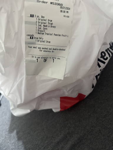 Read moreMost of the time my chicken is perfect. The sides average. At the drive through the females are detailed when taking my orders so everything is perfect. Males aren't so detailed, give me something I don't want. When I tell them I don't want honey BBQ, I want what I want. He acts as if it's my fault that I wasn't clear. But you're the one working. I'm having dinner, I'm not at work. So it's your job to make sure you get my order of what I'm paying for, correct? If you can't get me what I want, then give me my money back. He then corrected my order. Thanks. At the end of each order verify that the order is correct. Leaving out important information like your going to give me 5-6 wings. Then you should clarify that you're assuming I want honey barbeque wings. That's when I would've told you I don't like honey barbeque. I go to Kentucky for fried chicken, not...