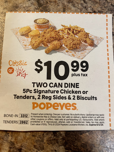 Read moreAbsolutely my worst experience at a Popeyes. I was the only car in the drive though. The girl took my order then asked me to pull around. She then proceeded to ask me again multiple times what did i order again with and attitude because she continued to forget. ALL I ORDRED WAS 2 ORDERS OF CHICKEN TENDERS. NOT THAT HARD TO REMEMBER. After about 10 minutes of trying to figure out what I ordered she gave up said I can not hear you you have to come inside. I was already talking at the pickup window, by this point there are about 7 cars behind me. I'm Sorry clearly I came though the drive though so i didn't have to come inside. At this point I'm Starting to get irritated the manager finally tries to help out this poor girl out. They finally get my order in the system and tell me to pull around and wait. So I wait and wait and wait. Watching every car go by that was behind me. Hmmmm I'll be patient 15 minutes, 20 minutes.Surprise I had to go inside anyways, look at that my order is sitting on the counter, I notify the manager how unprofessional the service is here meanwhile the girl that been trying to take my order the entire time is looking at me like I'm in the wrong. No apology from her just a disgusted look on her face. And to top it all of they didn't even get my simple order right no hot tenders only mild. Needless to say I will never return to this Popeye's. I will be writing an email...