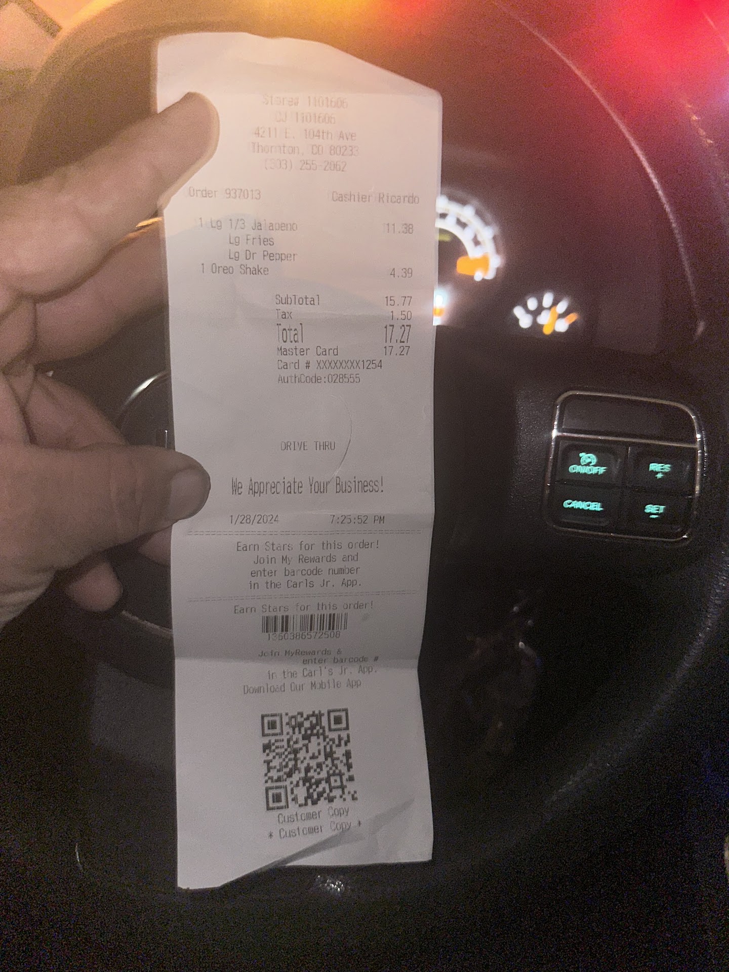 Read moreOrdered 3 meals. Ended up Paying for four. I take that as my fault but I did ask to change one meal for another. I thought the tender said 29 dollars which made sense and it ended up being 49 dollars. I thought little Of it and just went home. I didnât have time to argue. I had a sick wife and hungry daughter at home. Get home and my wife got the wrong burger. Specifically what she didnât want actually, and it seemed like it was made with old meat. Not made fresh for sure. Her onion rings were cold and old. Definitely not made fresh. My burger was alright. The patties were old. Just like the other burgers but the spicy-ness helped with that. Just not what I expect with Carlâs Jr. I expect that from Mickey Ds or BK or TB. Not CJ. Iâll wait a little longer for fresh food and the right order. I think anyone would. For a first time visit, I wasnât satisfied. If I came to âyourâ house on a service call, you would expect a good job be done. No mistakes. No excuses. Just get it done right and in a timely manner. Is that a lot to ask for from our meals?