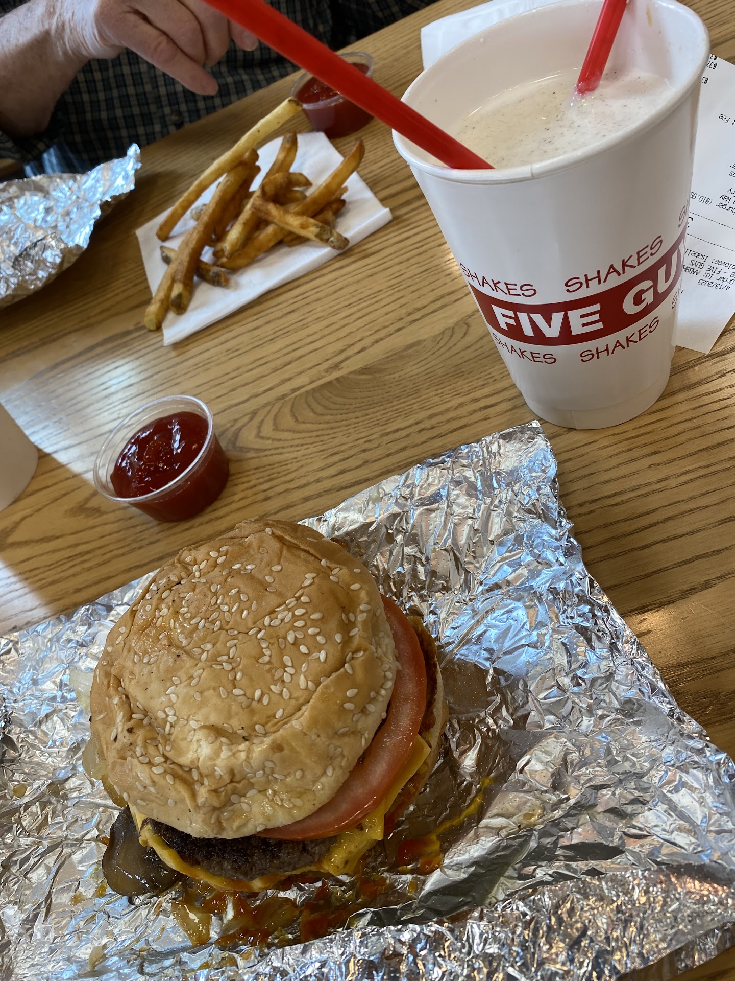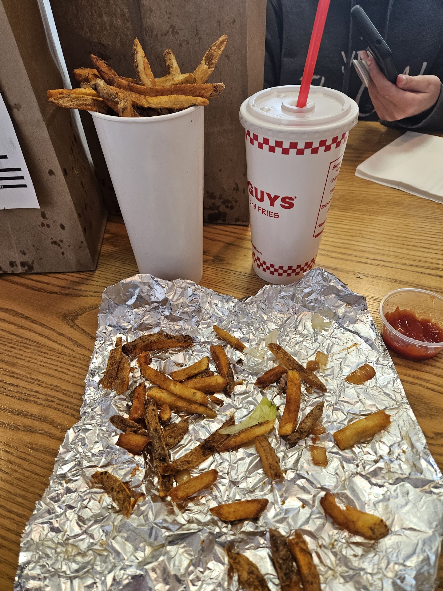 I haven't been to 5 Guys since covid and thought we would get a bite before heading over to do some retail shopping. The peanuts are cool to snack on before you order, but not really needed at the time we went because there was no line...and I think I kinda know why, but we will get to that. The guy who took our order was great; you can tell he isn't really interested in working in fast food, but who is all-in on that? He asked my how my day was and it seemed like he genuinely cared, so we engaged in small conversation while the others in my party figured out what they wanted. We got 2 double burgers, 1 hot dog, 3 drinks, 2 small fries, and 1 large...because I didn't know. With gratuity, $70. If you look at my other reviews and the restaurants I go to, money is not the issue. It's all about value. This better be the BEST burger I've ever had. Well, it wasn't, but the ingredients were fresh enough. Let's talk about the fries. After today my beautiful bride renamed 5 Guys, 5 Fries. When you order fries, they dump, literally dump an equal helping in with your fries. That's cool if I would have known, now I feel like I just paid $70 for 8 chopped, fried, and seasoned potatoes. I took home a 2 pound bag of just fries, I didn't want to throw them away and I had to feel like I went home with something. Got home, threw them away. Aaaaaand finally, the atmosphere is that of a 1950's burger stand with a bunch of technology. The atmosphere is a dime a dozen, but kudos for not automating the person taking your order. The real question, would I go back? Probably not. It's just not THAT good, but if you are looking for a place to clean out your colon and walk around town money, try 5 Fries. IIIIIF you are young and on a date, go dutch. If you don't know what that...