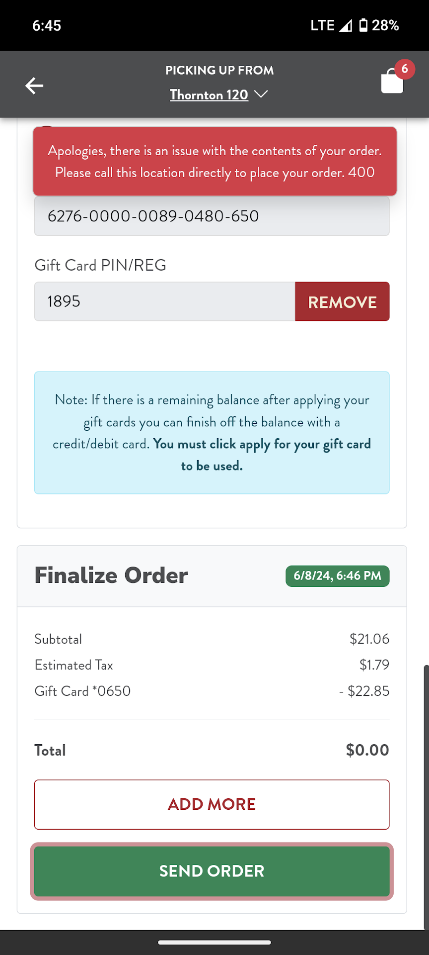"Apologies, there is an issue with the contents of your order. Please call this location directly to place your order.400"
