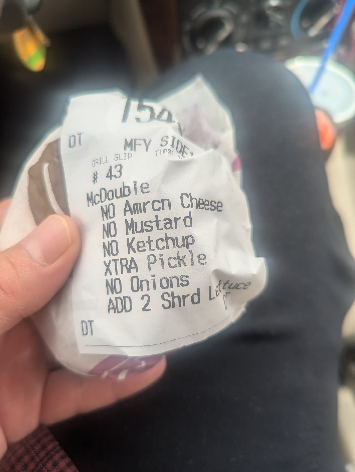 I went to McDonald's today and got a Filet-O-Fish combo with a bacon cheeseburger on the side. I was eating it in my vehicle in the parking lot and listening to an audio book when I glanced up and saw the McDonald's worker I ordered outside having a cigarette.