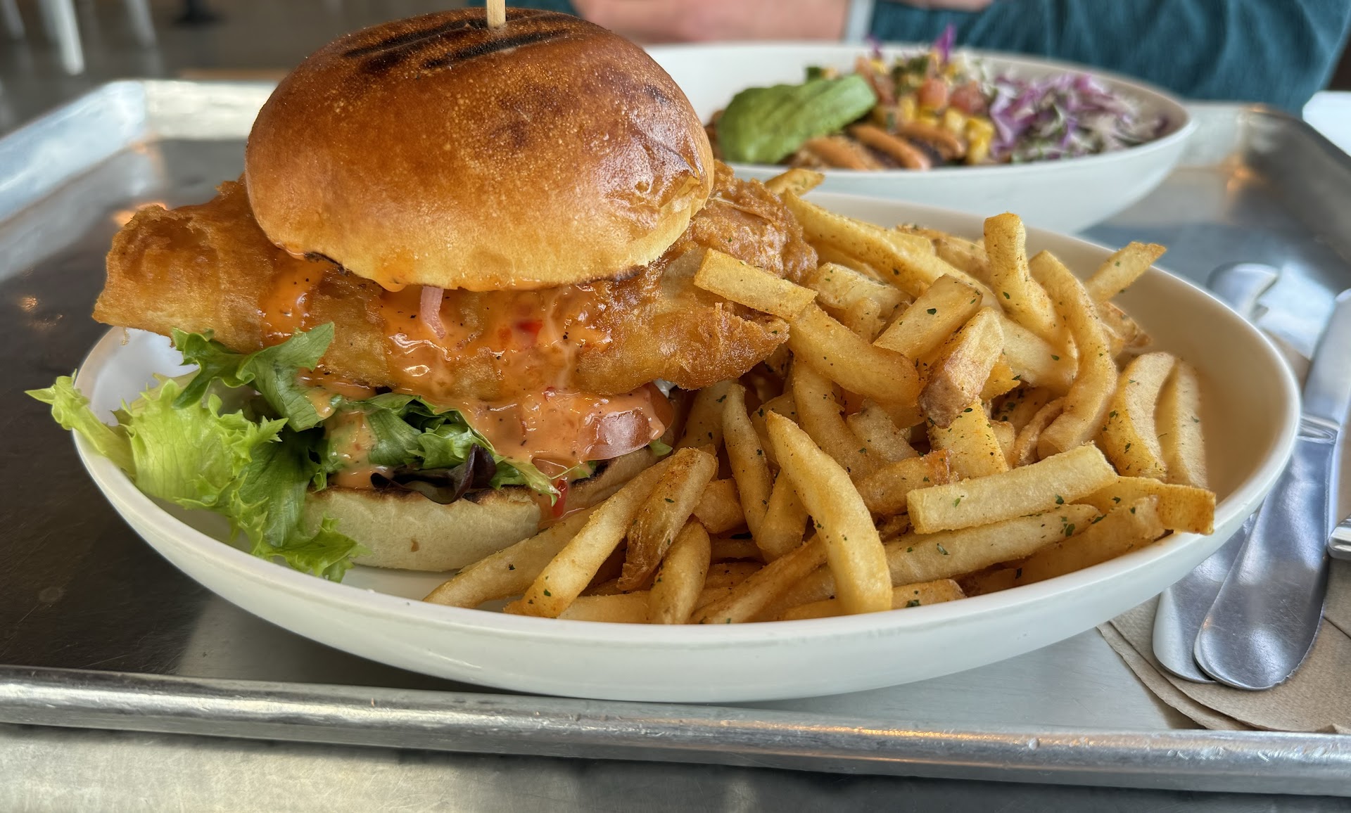 Read moreI'm not a very big fan of fish, but I have really enjoyed the food here. I visited hear with my wife. I had the crispy fish sandwich and she had the mahi mahi plate. The fish sandwich is a very crispy, large, well-seasoned piece of fish. The ingredients are incredibly fresh, and their dynamite sauce is very tasty. The fries are good, but not amazing. I should have gotten the street corn on the side instead. The corn is very good, though I would have preferred cotija rather than the parmesan cheese. I am a huge fan of the fried fish here. The fried fish in the fish taco is very large and filling. The clam chowder is only so-so. It’s not as thick as I typically prefer, but the flavor is good. My wife had Mahi Mahi with rice. For her side, she got the cilantro lime slaw. The fish was well-done and seemed overly cooked, I would have preferred it a little less cooked. Their sauces and seasonings blend together very harmoniously. The fries are not very crispy, but they were still okay. My main complaint is that the fish seemed overcooked and fries weren't crispy, which I found very minor compared to the enjoyability I found in...