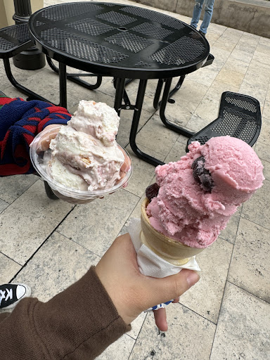 I have had a couple of flavors from here and by far strawberry cheesecake (not pictured) is my favorite. I love cheesecake and the bites in it are so delicious as well as the strawberry flavor. Black raspberry chunk is my second favorite also not pictured. The flavor of the raspberry is so tasty and the chunks of dark chocolate pairs well. The dark chocolate is super rich so keep that in mind. What is pictured would be the raspberry cheesecake in the cup. Which of course I love the chunks of cheesecake, but the overall flavor was lacking. Banana crème pie was also very delicious which is not pictured that would be my third favorited. The banana doesnât taste artificial. The black cherry is pictured on the cone next to the raspberry cheesecake. The flavor is there itâs not overpowering and it has chunks of cherry. Most recently I had brownie dough pictured by itself (had taken a bite already before taking the picture). If you like chocolate but not too much I feel like this is perfect. Itâs a mixture of Chocolate and vanilla with delicious chunks of cookie dough and brownies. The staff is very friendly and helpful. There is always almost a line, but it does move fast. The scoops are pretty big in my opinion all of the pictures are...