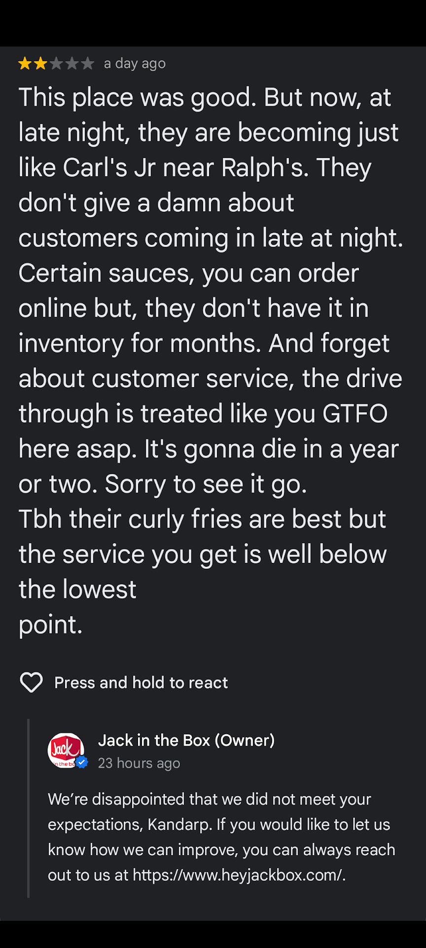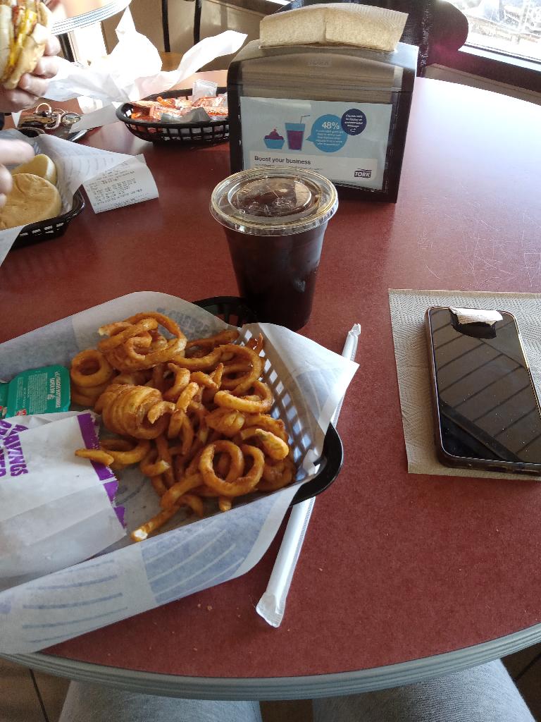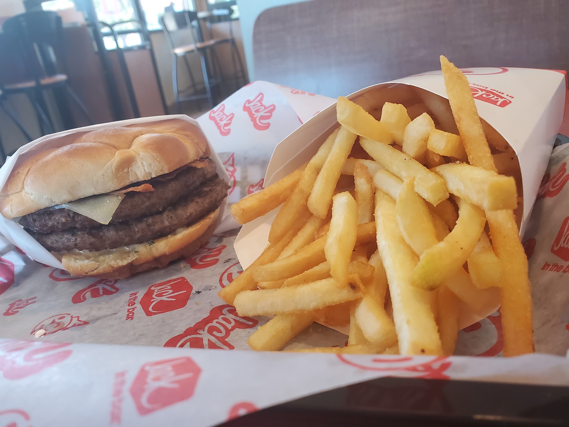 Read moreA friend and I decided to stop by Jack and the Box📦. I suggested that we could eat,chat and relax instead of waiting for the long line at the drive thru. When we parked, stepped in there where three tables occupied with customers. This location has been here since 2018... since I would stop in for an order. I ordered curly fries and Jalapeno Popper's and he two breakfast sandwiches. After he paid..I needed to make a trip to the restroom 🚽💦. The doors are locked and when I stepped in first. What a smell...😂😂. The manager should keep the public toilets clean,, after washing my hands. I went to sit down at the table and stools. My friend grabbed our order from the cashier and we preceded to eat away. The fries were delicious and not over cooked. The Jalapeno Popper's we're slightly cold. Not hot to the touch.. I included some pictures... normally Jack and the Boxes are just a meal for people on the go. As well as people who are short on time for a sit down meal. I recommend the...
