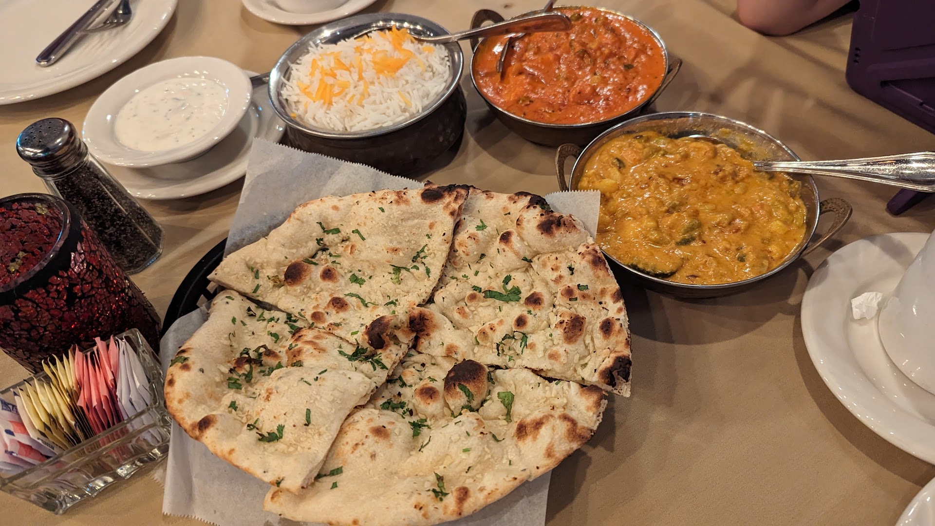 We enjoyed the chicken korma and were happy to find that it consisted entirely of white meat The spice levels were perfectly balanced and met our expectations of not too spicy or not too bland (we ordered a medium spice). We ordered garlic naan (of course), rice, and some samosas.
