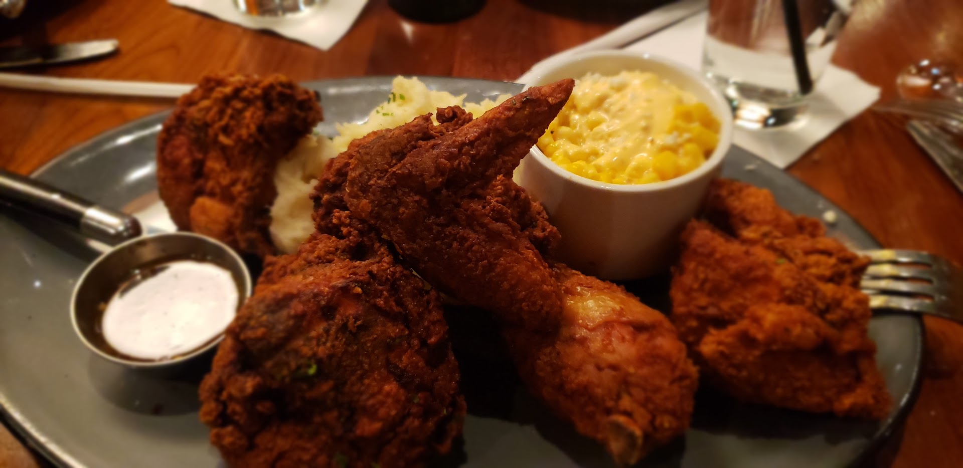 Read moreWith an extensive wine and cocktail list the entree selection was a lot easier to tackle. You think who orders Fried Chicken at a nicely appointed restaurant? Well it's one of their specialties. It takes a little longer since it's made fresh put worth the wait. For Wednesday night at 7 p.m. the place was well attended. Although we do not have a reservation we were greeted a friendly and good-looking young man that sat us immediately. The buttermilk fried chicken comes with a generous portion of chicken pieces, mashed potatoes that are just like homemade, and a yellow corn side dish with some type of a sauce that I did not quite get the name of. For the fish tacos you have a choice of steelhead salmon or blackened halibut. My friend chose the salmon and raved about the tacos. Garrett was our server and he checked on us often. He was very accommodating and attentive. The only concern was that because the chicken dinners take a little longer the fish tacos were held back. A waitress brought the dish out and apologized because she thought our other food was already served. She apologized for bringing it out sooner then the other dishes. In essence this means that the fish tacos would have been sitting underneath a hot lamp. We were not asked if we wanted to wait to be served together or if we wanted the food brought out as it was ready. Either way if we wanted to wait we wouldn't have wanted the tacos to sit there under a hot lamp but made fresh closer to when chicken dinner was done.
