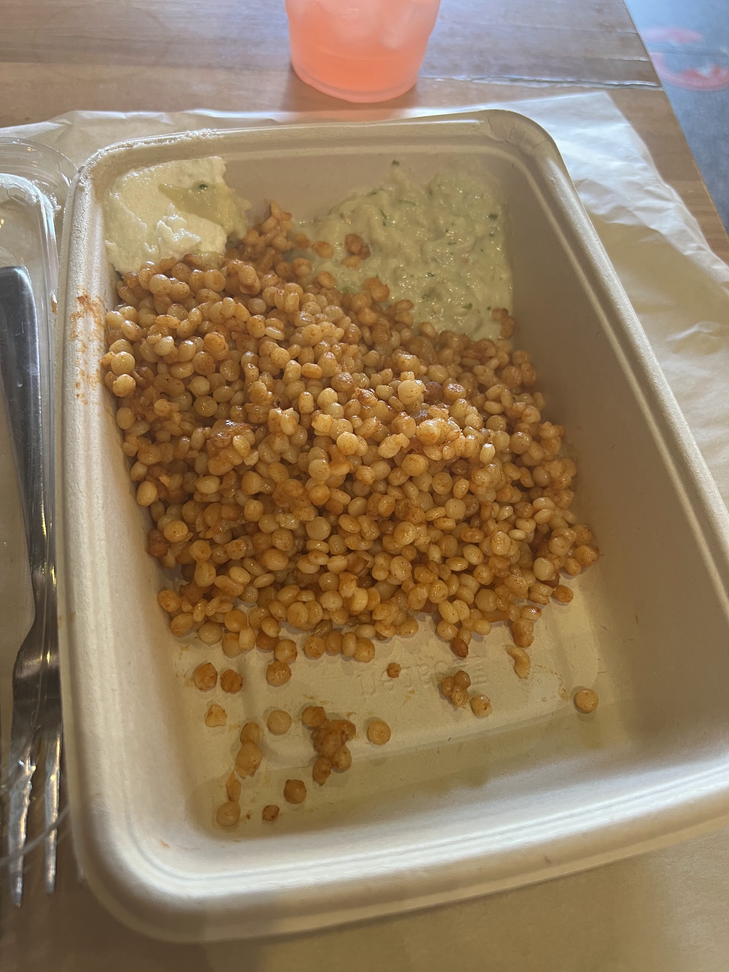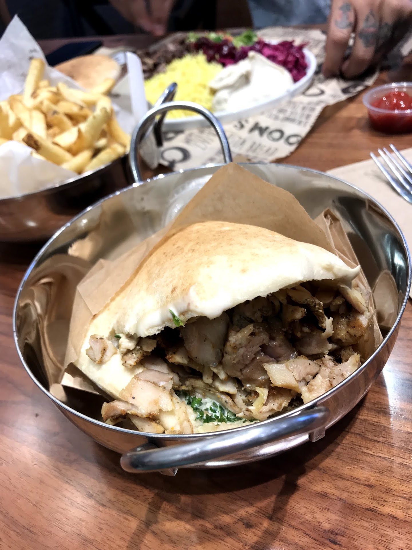 I went for lunch at Soom Soom with 8 co-workers and everyone loved their meal. Soom Soom offers a Mediterranean menu with a mix of Persian, Lebanese and Israeli food items. Their food is very flavorful and the portions are generous. They have huge wraps and even huger plates, which come with a whopping 4 sides, in addition the entree protein. They have chicken and beef shawarma sliced directly from a slow-turning, vertical spit, beef koobideh, chicken kebob, ribeye steak, as well as roasted cauliflower and felafel for the non-meat eaters. They have a large selection of sides, including hummus, babaghanoush, tabouli salad, Mediterranean salad, pickled cucumber salad, red cabbage slaw, yellow basmati rice, Israeli couscous, and more. They also have an a la carte menu with stuffed grapes leaves, fries, and many of the above sides. They have a couple of desserts, including baklava and chocolate mousse. I highly recommend you try Soom Soom for a hearty and healthy meal that's not too heavy...