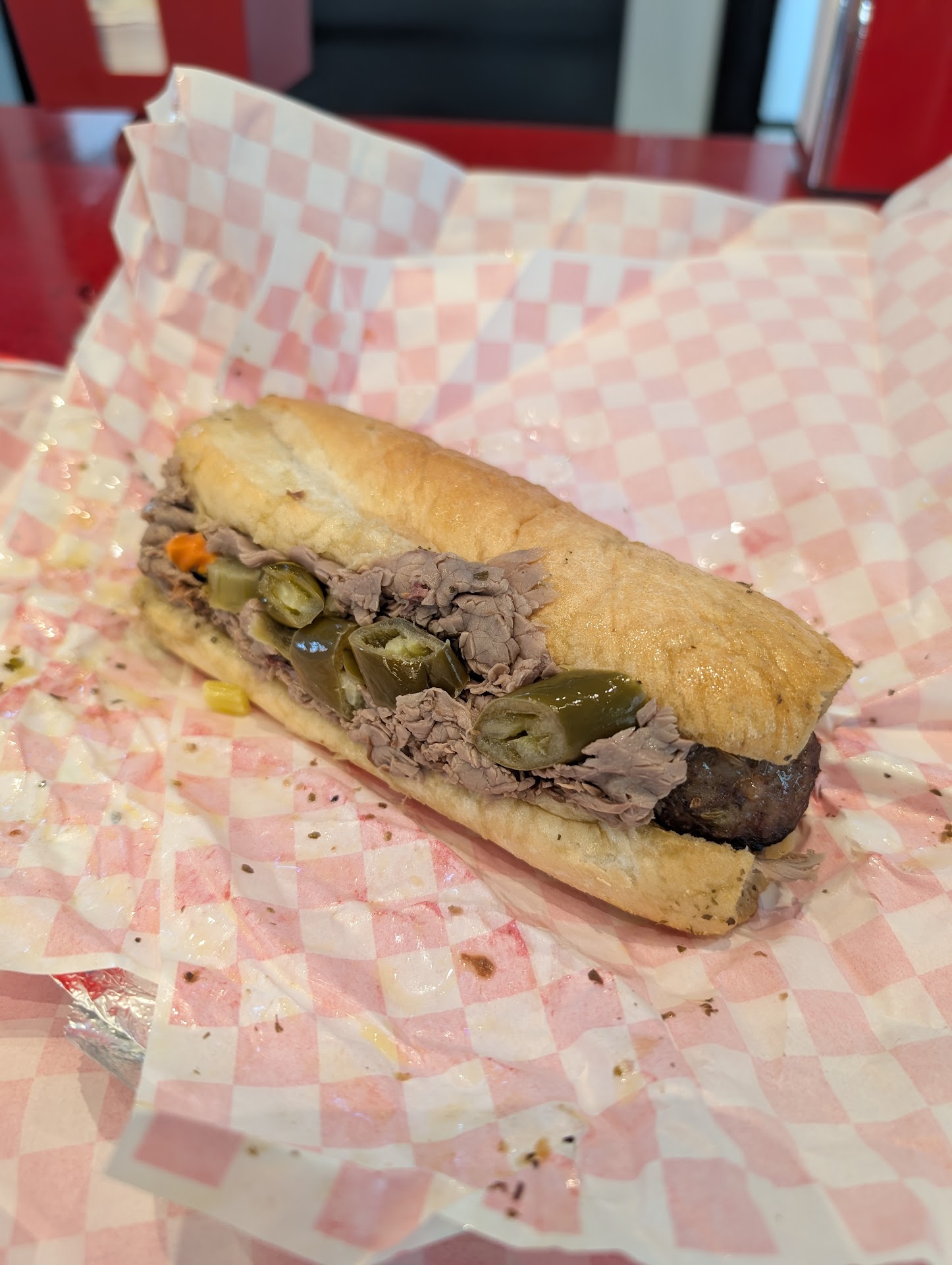 Let’s talk about the food: the traditional beef sandwich with peppers is hands-down my favorite. The bread is perfect—soft enough to soak up all that glorious jus, but sturdy enough to hold together until the last bite. The beef? Tender, juicy, and piled HIGH. And those peppers—just the right kick to make you sweat a little and smile a lot. Every bite is a flavor bomb that takes me straight back to the Windy City.